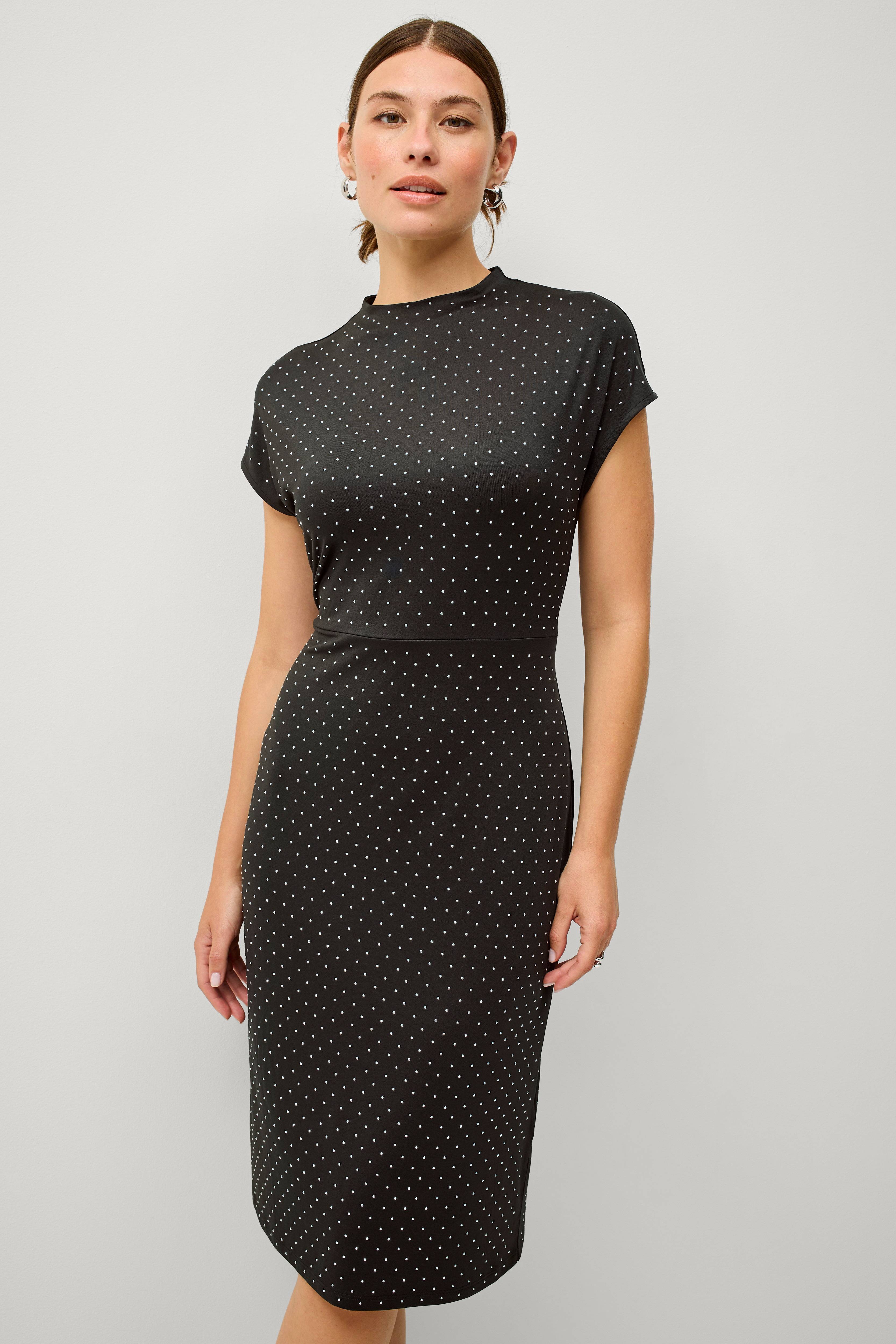 • Lett figurformet modell i jerseystoff med rhinstener overalt