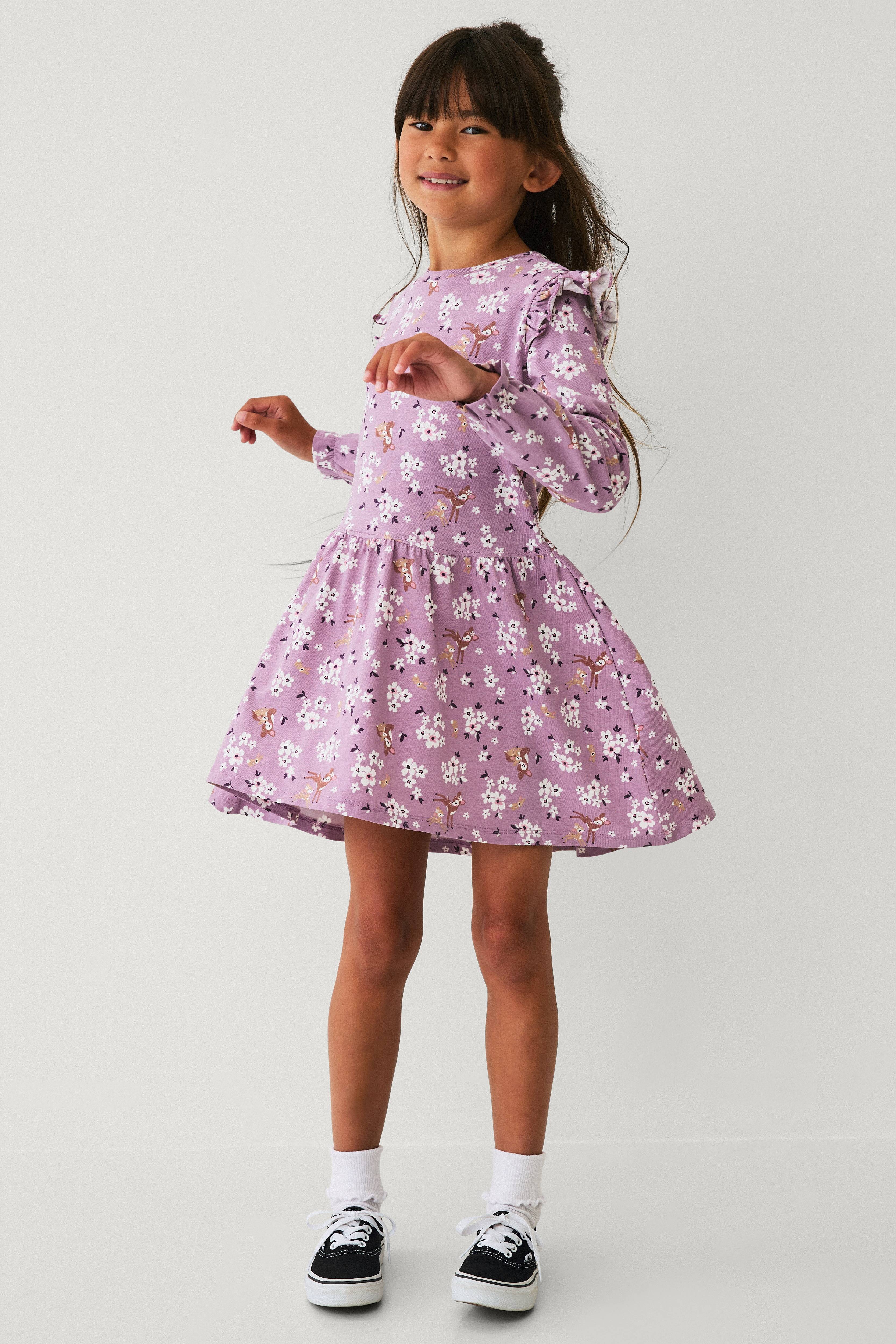 • Langermet kjole i myk, stretchy bomull• Rund hals• Påsydde volanger over skuldrene• Utskjæring ved midjen med rysje• Gummistrikk i ermeslutten• Litt lengre bakside