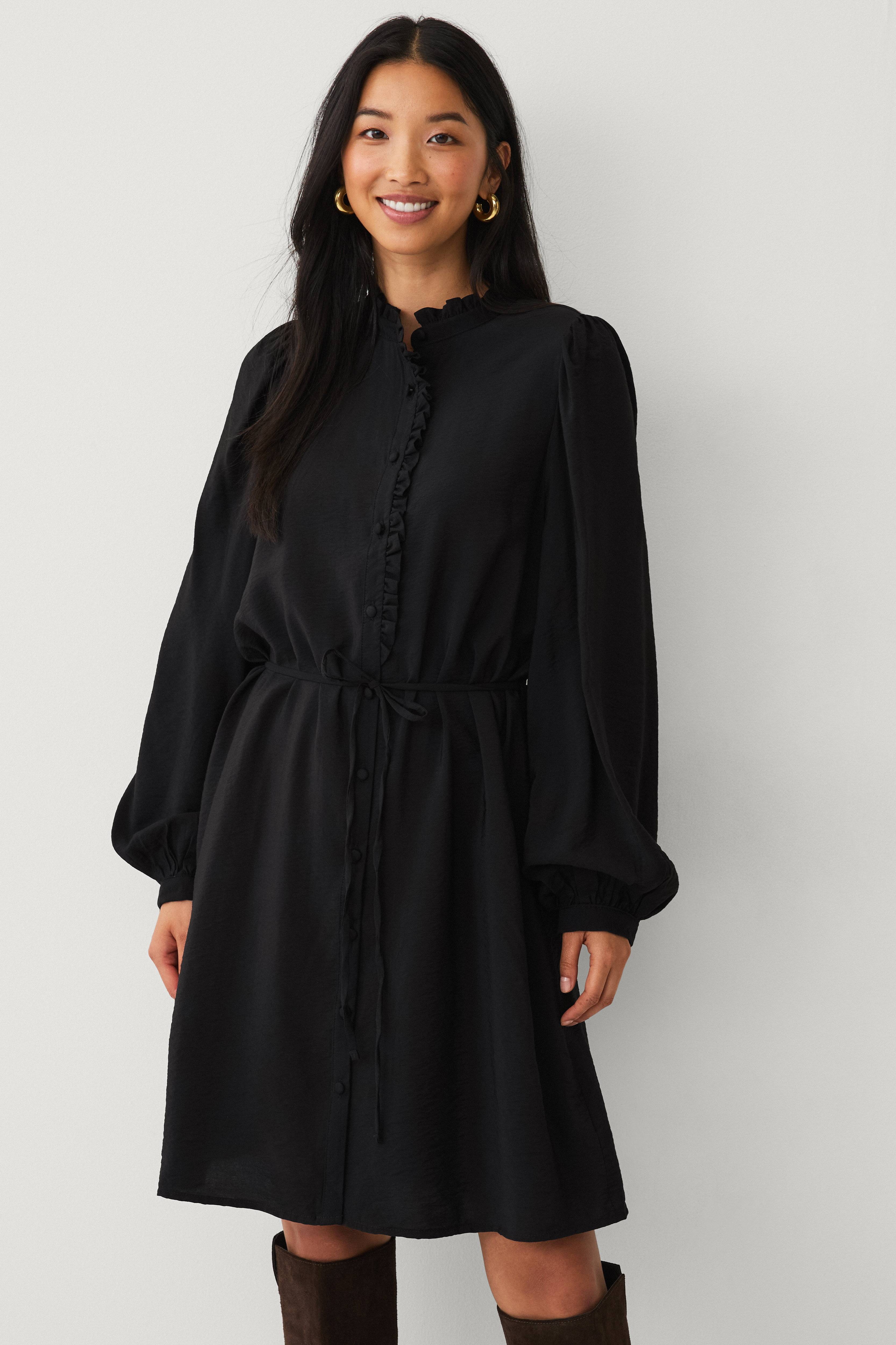 • Lett skrukket kjole i viskosemiks• Høy krage• Lange puffermer• Mansjett i ermeslutten• Avtakbart knytebånd ved midjen• Knappstolpe hele veien fram• Normal passform• Lengde: 96 cm i størrelse S