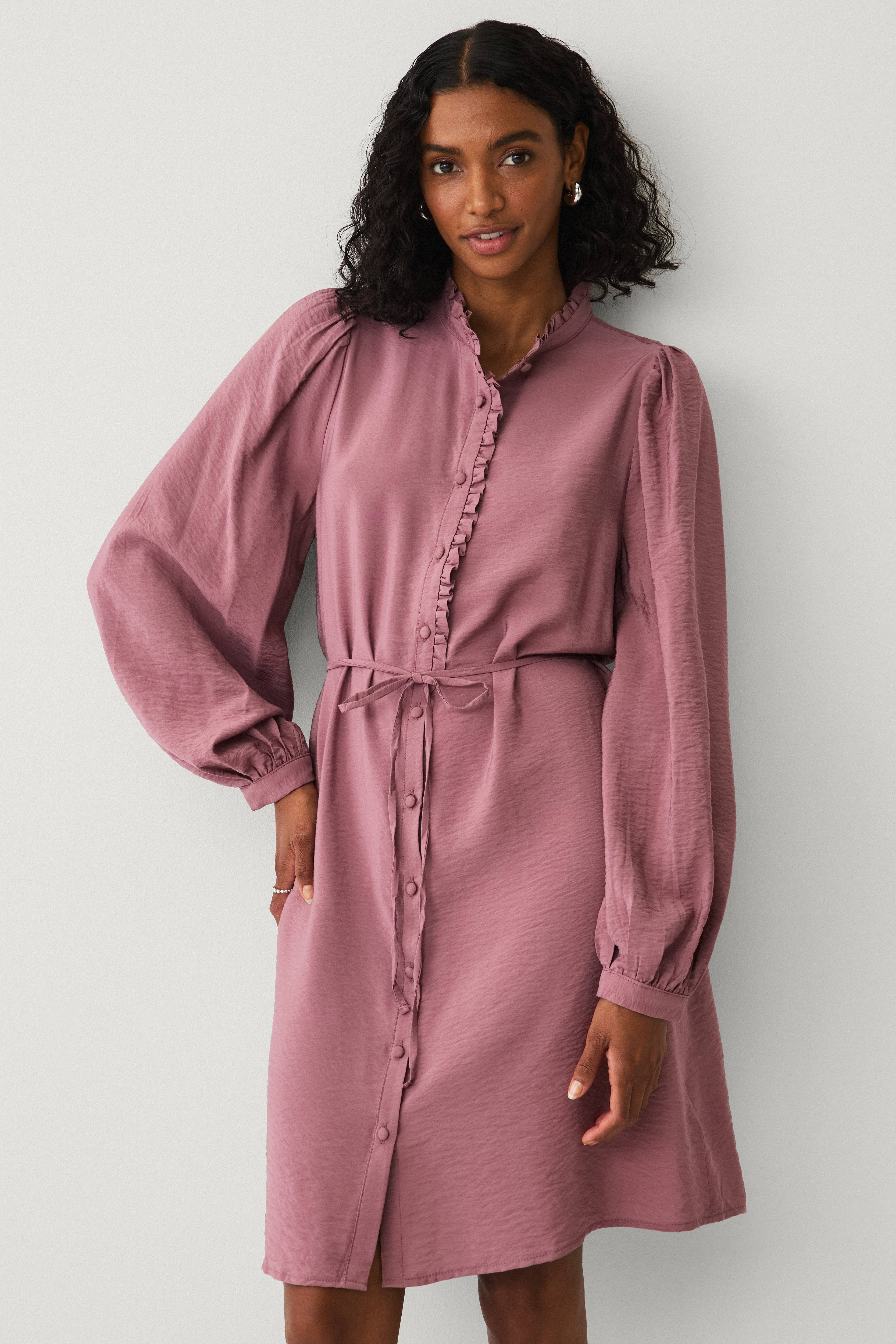 • Lett skrukket kjole i viskosemiks• Høy krage• Lange puffermer• Mansjett i ermeslutten• Avtakbart knytebånd ved midjen• Knappstolpe hele veien fram• Normal passform• Lengde: 96 cm i størrelse S