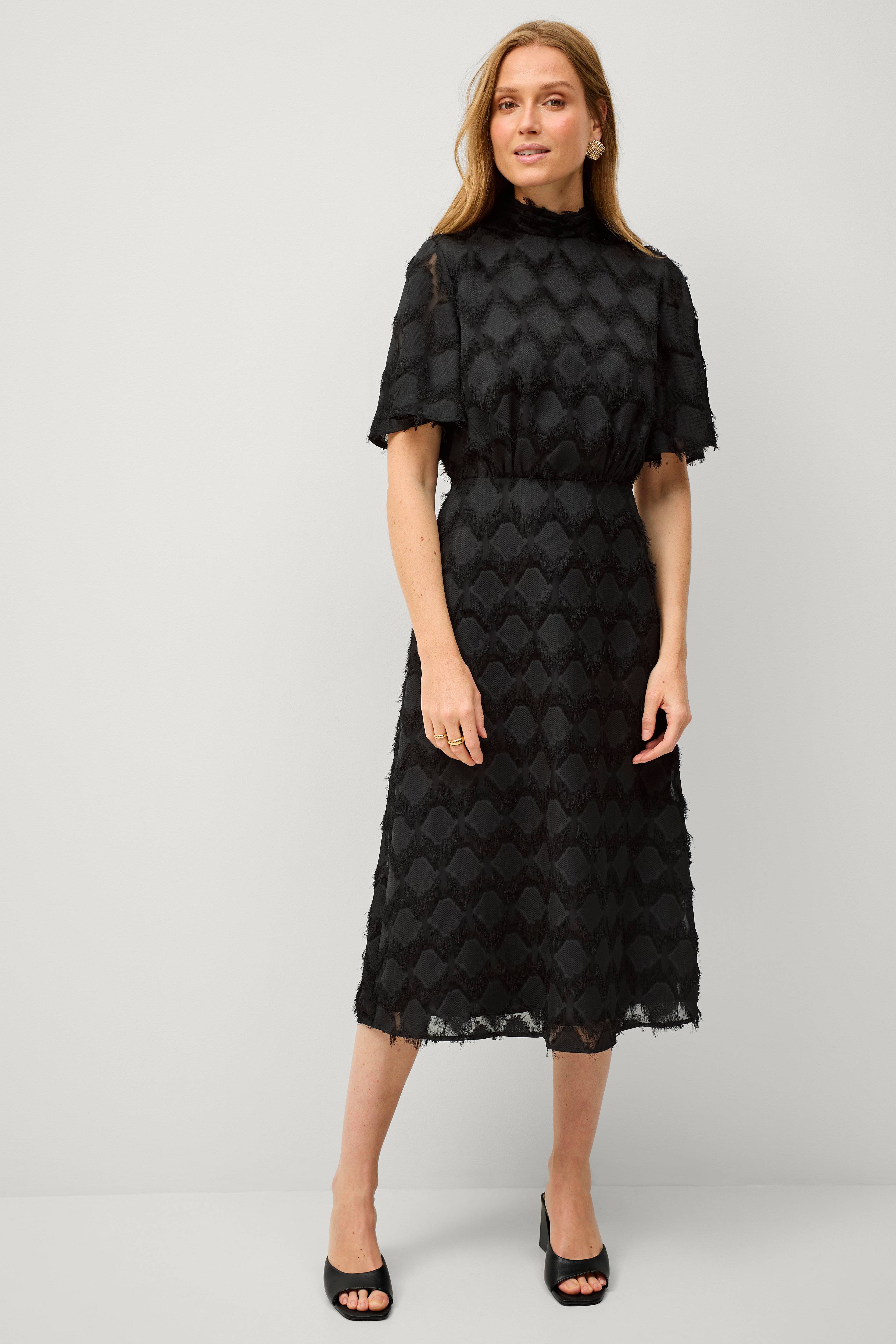 • Lang, figurformet modell i organza med frynser• Halvhøy krage med fold og glidelås i ryggen• Kort, bredt erme• Definert midje• Fôret• Lengde: 120 cm i størrelse 36