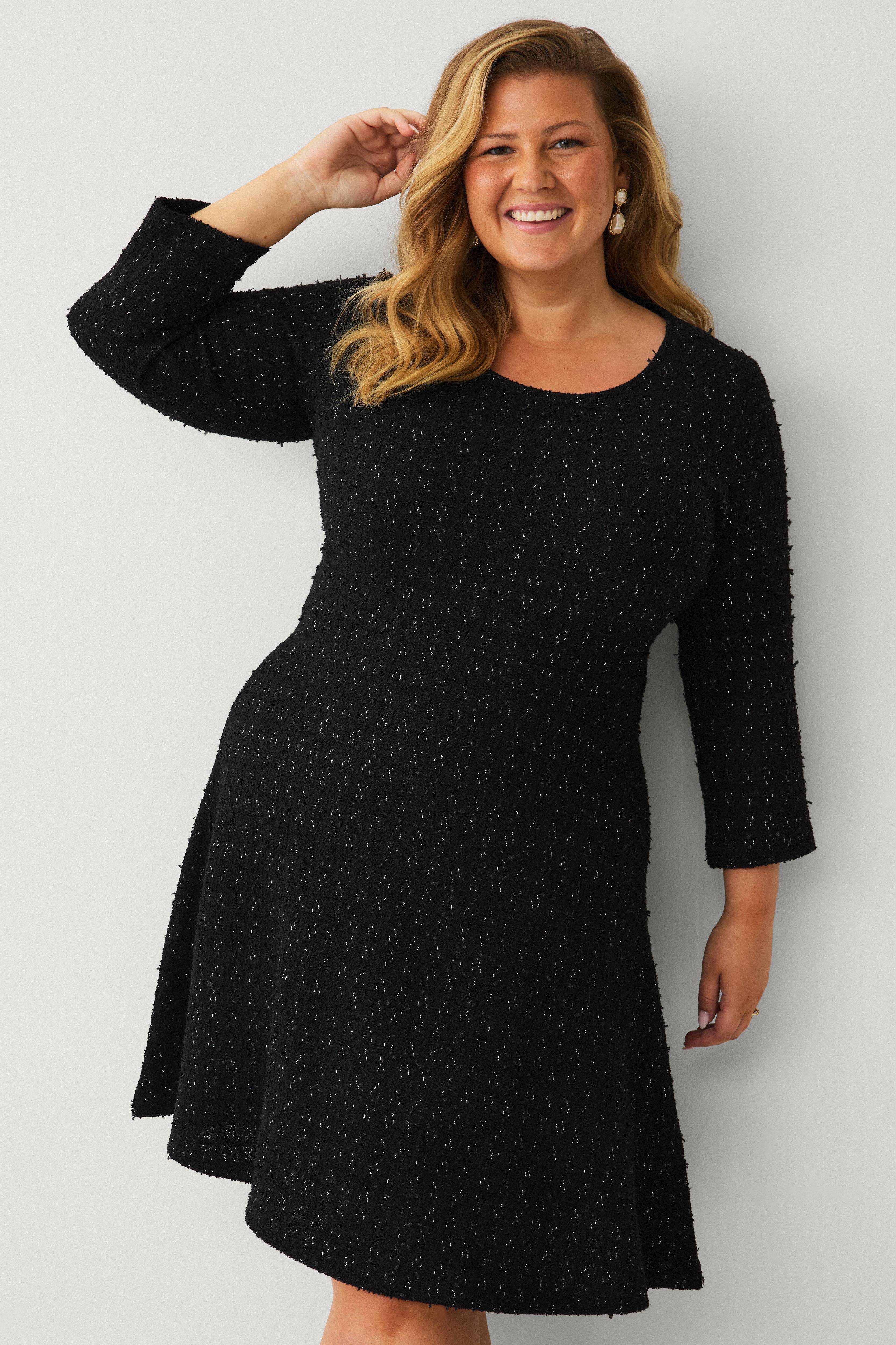 • Kjole med struktur og glittertråd • Rund hals • Ermer 3/4 lang • Utskjæring ved midjen med utsvingt nedre del • Lengde: 106 cm i størrelse L • Dette produktet er en del av Ellos eksklusive kolleksjon i samarbeid med Linda-Marie Assergård.