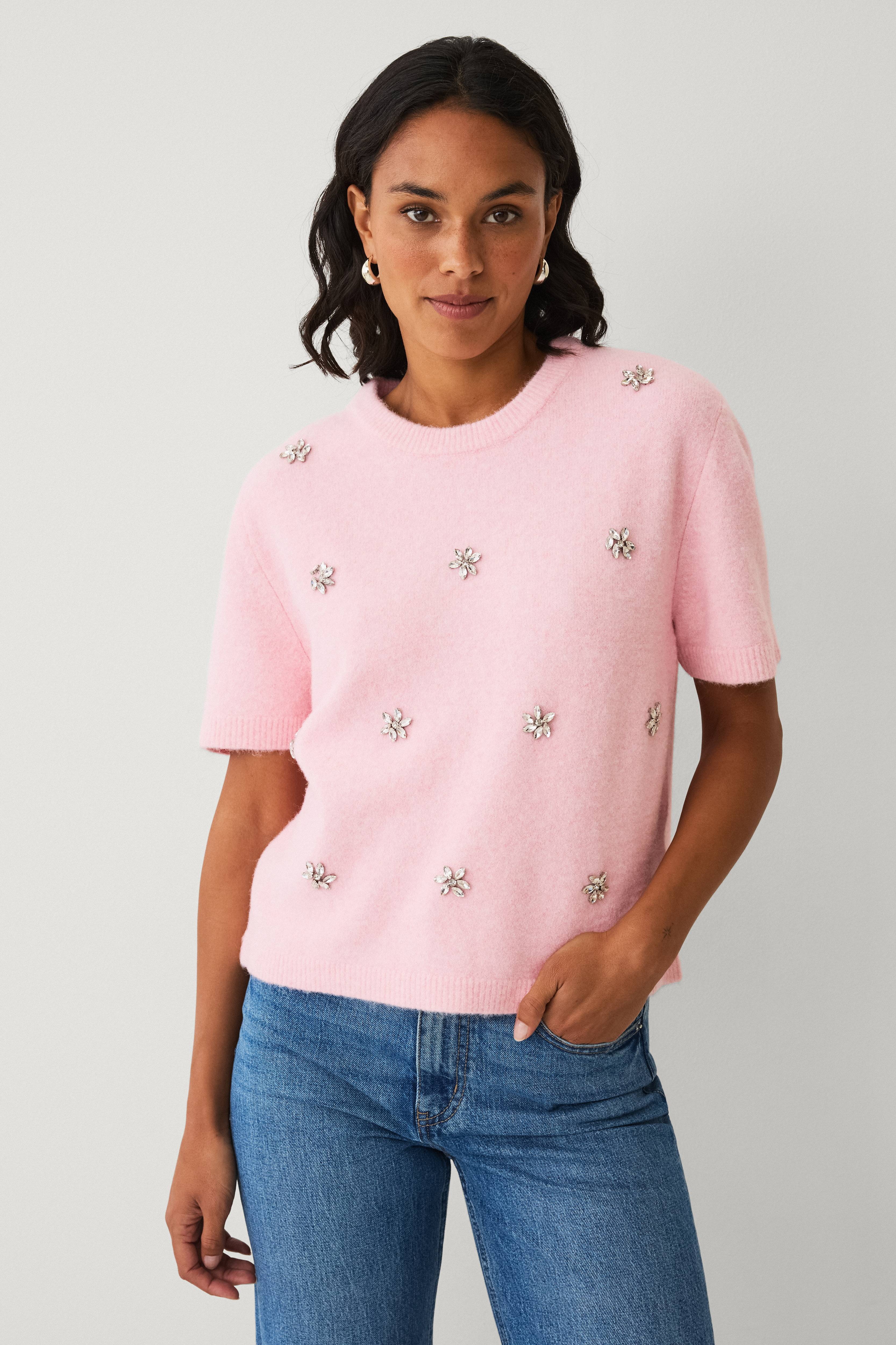 • Strikket genser med korte ermer• Rund, ribbet hals• Glitrende, dekorative rhinstener foran• Ribbet mansjetter i ermeslutten og på bunnen• Lengde: 56 cm i størrelse S
