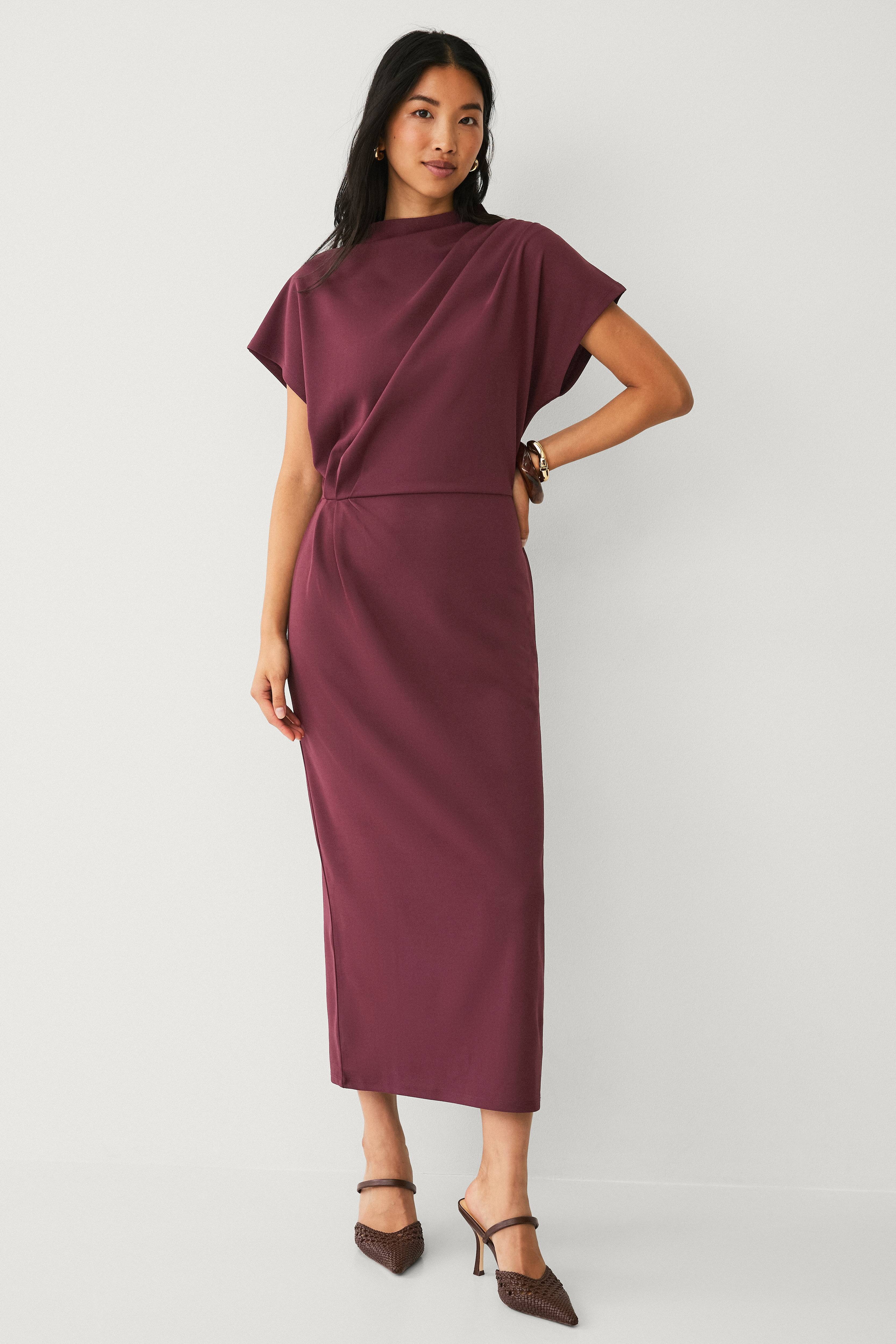 • Plusstørrelser • Figurformet modell • Halvhøy hals med draperingsfolder på en skulder • Definert, elastisk midje med draperingsfolder i siden • Utringet skulder • Lengde: 130 cm i størrelse S