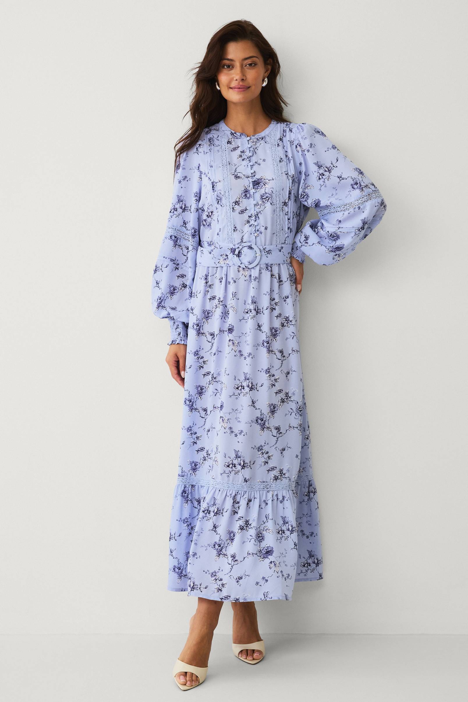 • Kledde knapper foran• Blondedetaljer• Sydd folder• Lange ballongermer med vaffelsøm i ermeslutten• Belte• Lengde: 139 cm i størrelse S