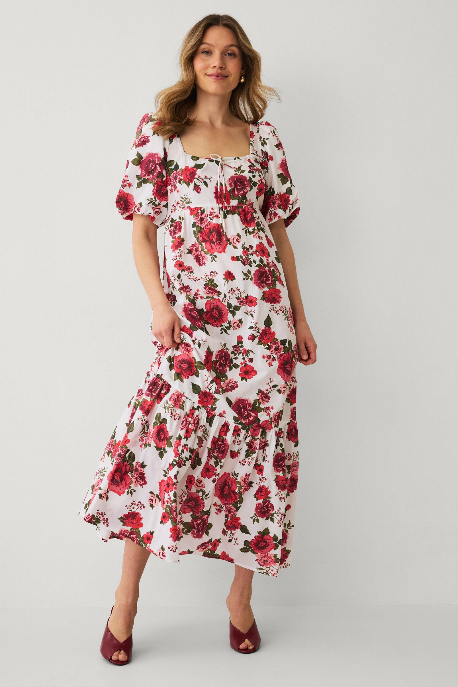 • Lang kjole i sprø bomull• Firkantet hals med snøring• Vaffelsøm i ryggen• Korte bobleermer• Volang på bunnen• Lengde: 138 cm i størrelse S