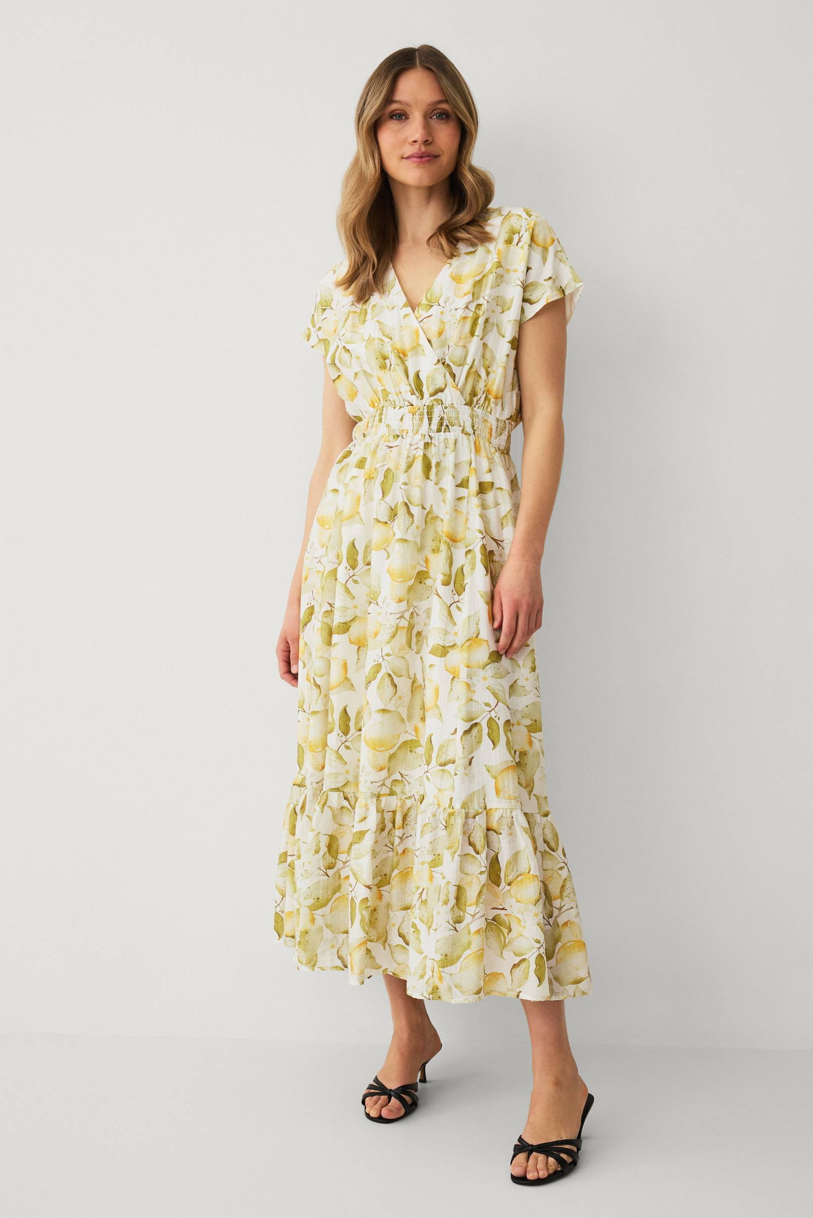 • Lang, ermløs kjole i lett skrukket kvalitet• V-hals snitt med omslagsdesign• Elastisk vaffelsøm ved midjen• Utsvingt skjørt med bred volang på bunnen• Fôret• Lengde: 134 cm i størrelse S