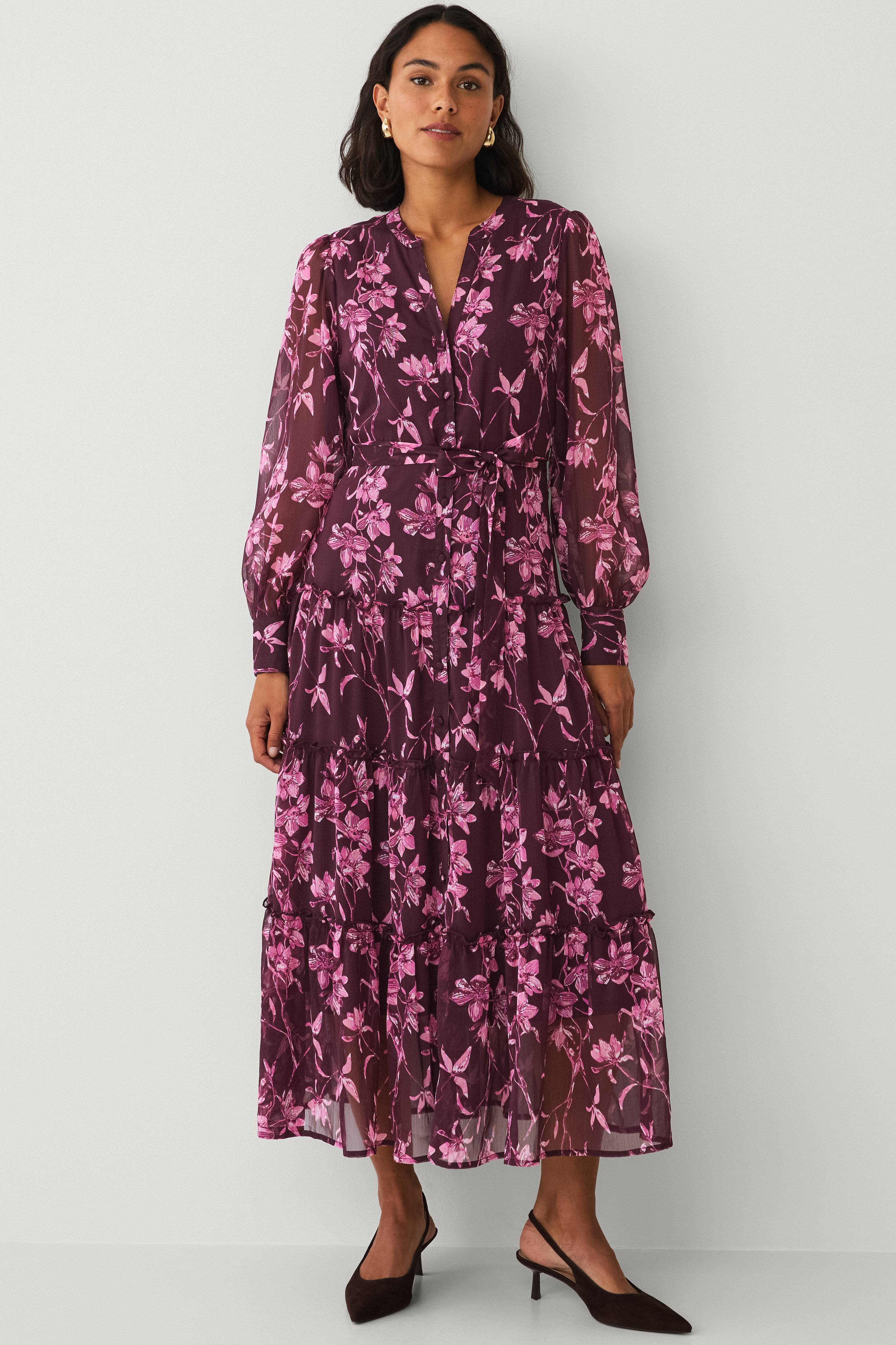 • Lang, fôret kjole i chiffon • V-formet hals • Lange puffermer med mansjett og knapper • Avtakbart knytbart belte ved midjen • Kledde knapper hele veien fram • Volanger på bunnen • Lengde: 135 cm i størrelse S