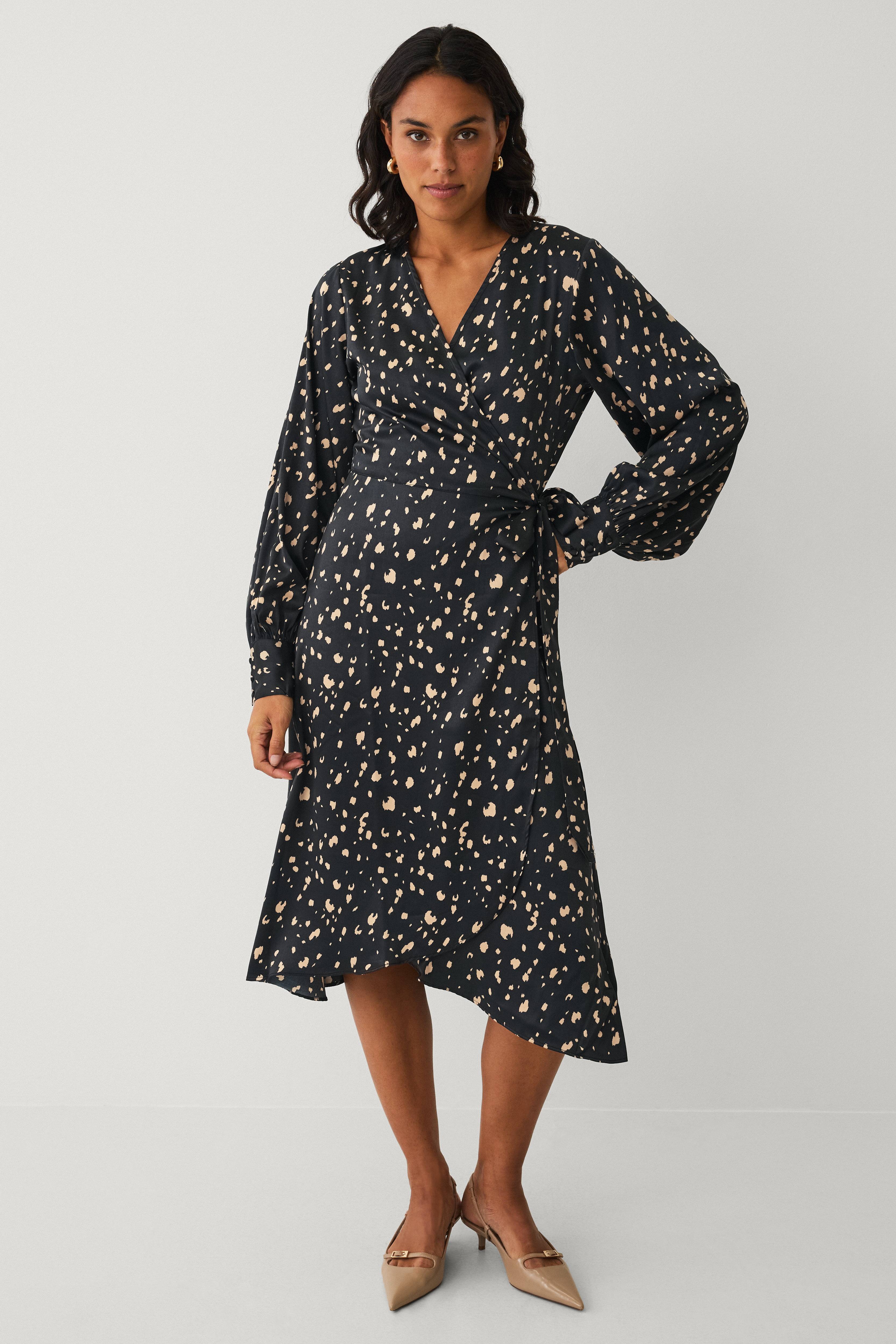 • Kjole med omslagsdesign i sateng• Knytbar tråd ved midjen• Lange ermer med mansjetter i ermeslutten• Lengde: 123 cm i størrelse S