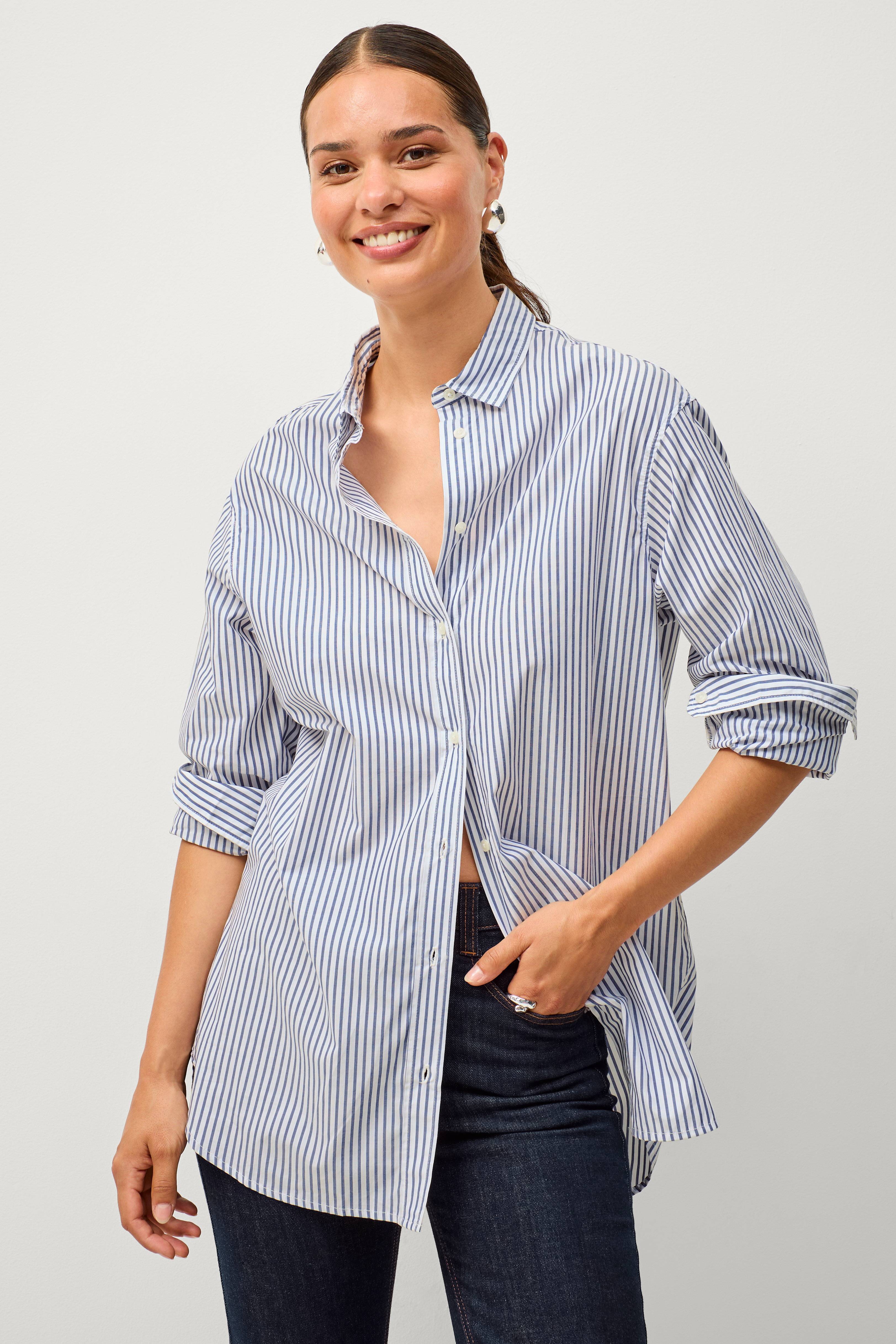 • Plusstørrelser• Rett, lang oversizemodell• Liten krage• Bred fold oppover ryggen• Langt erme med mansjett• Avrundet hem• Skjorte i sprø bomullspoplin• Lengde: 82 cm i størrelse 34/36