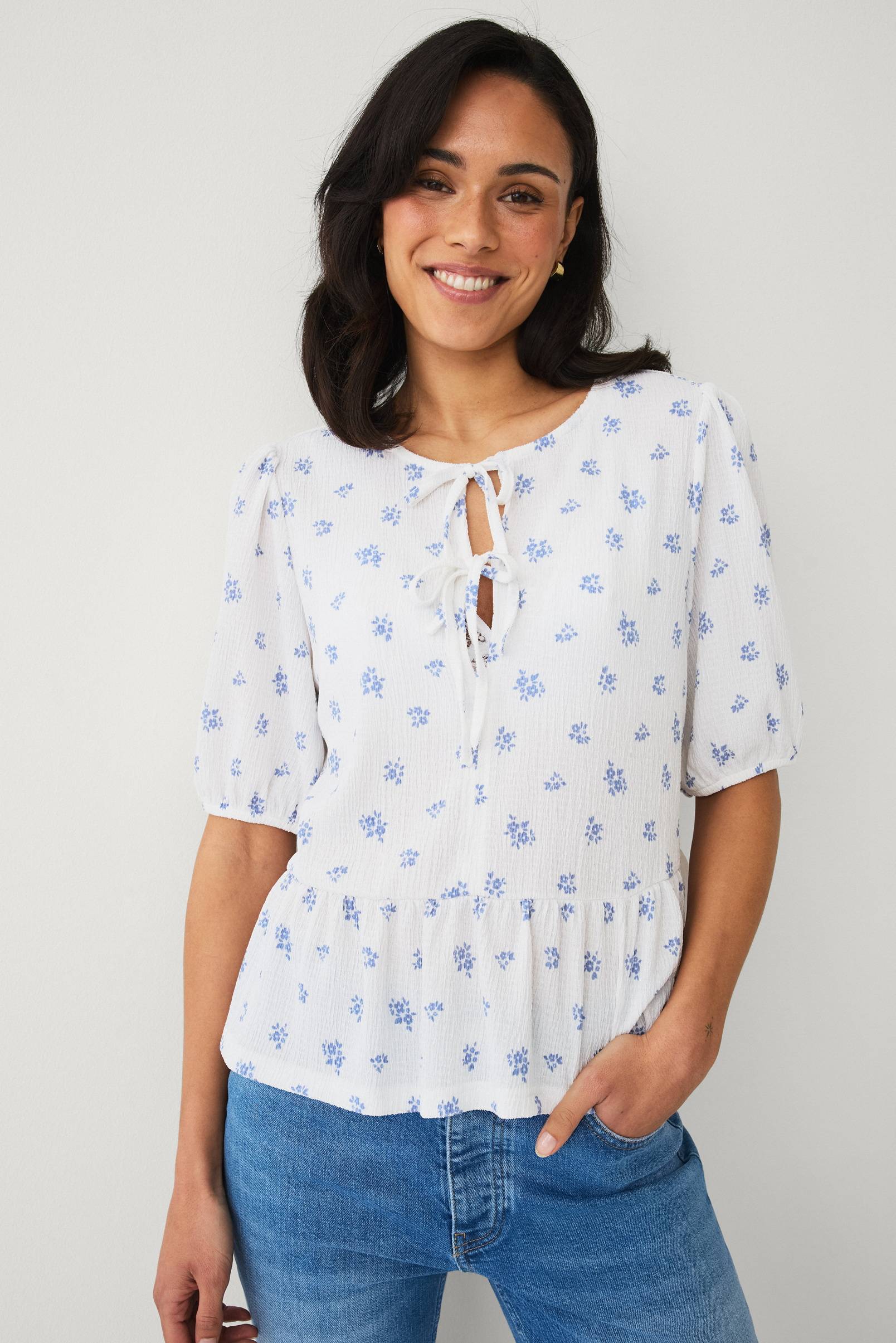 • Topp i mønstret polyesterblanding med riflet struktur• Korte puffermer med gummistrikk i ermeslutten• Avrundet hals med åpning og knytbar tråd foran• Peplum-design på bunnen• Lengde: 59 cm i størrelse S