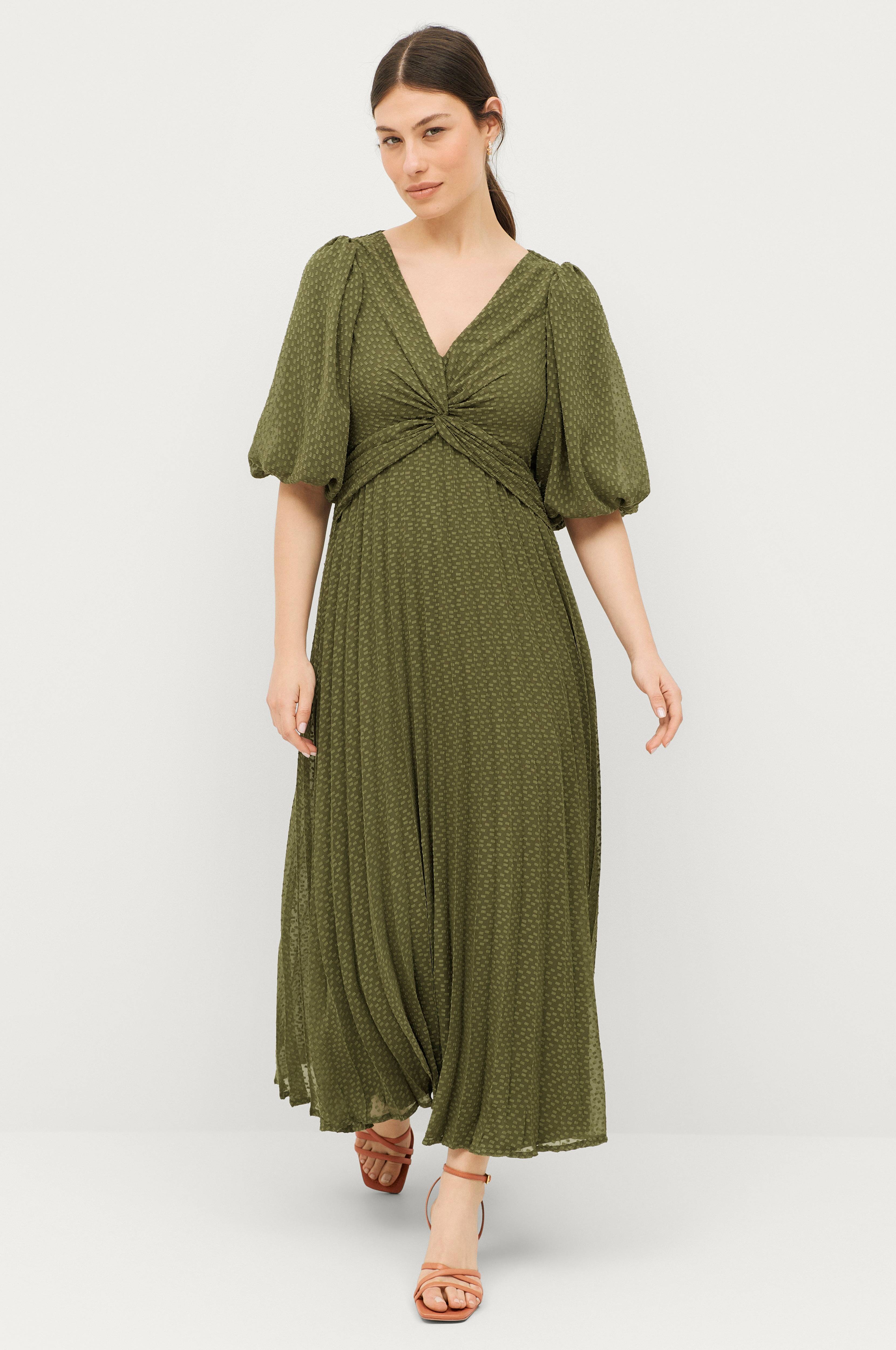 • V-hals snitt• Knutedrapering foran• Halvlange bobleermer• Plissertt skjørt• Skjult glidelås i siden• Laget av chiffon med strukturmønster• Trikotfôr• Lengde: 130 cm i størrelse 36