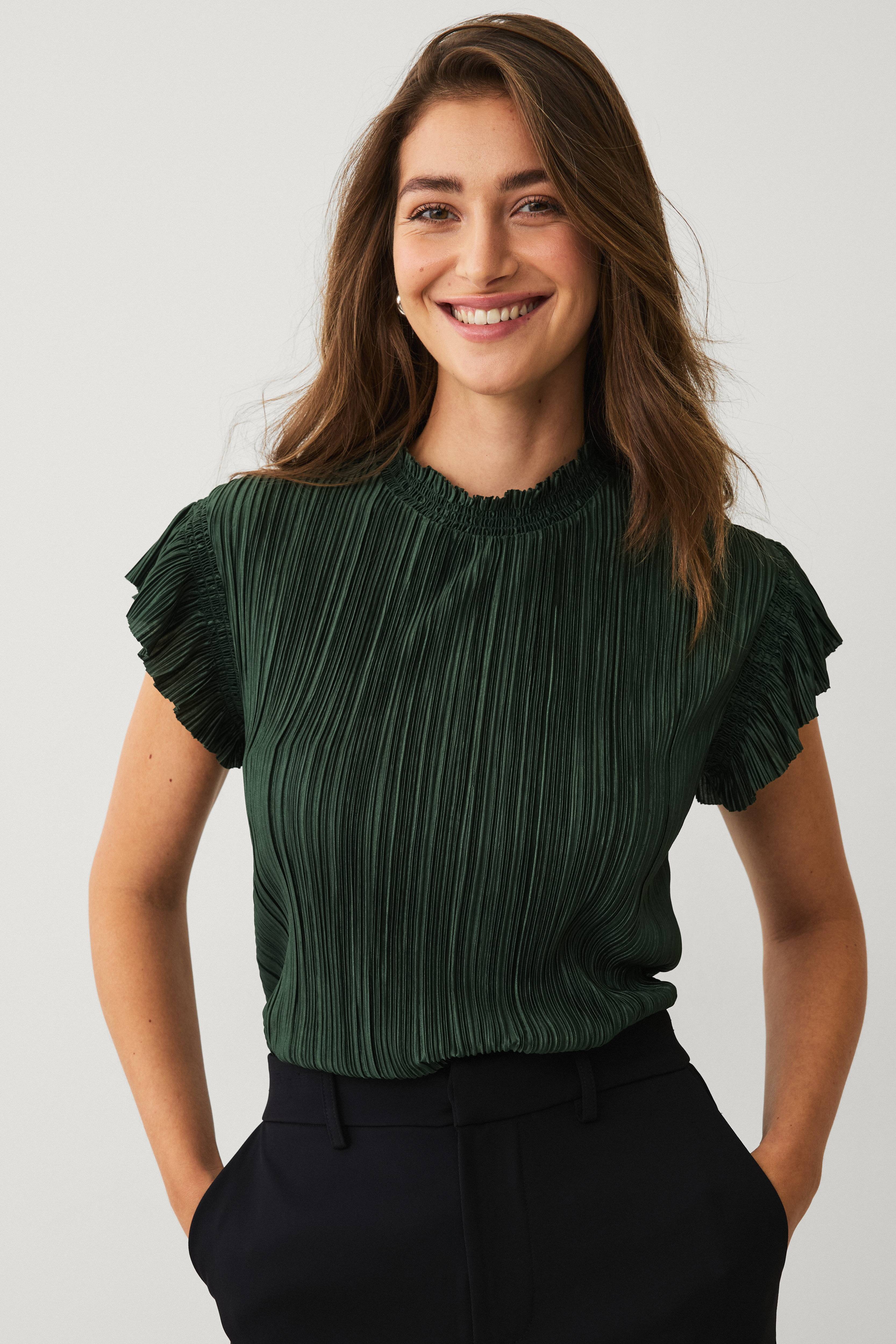 • Plissert topp• Kort erme med elastiske sømmer ved skulderen• Halvhøy krage• Lengde: 57 cm i størrelse S