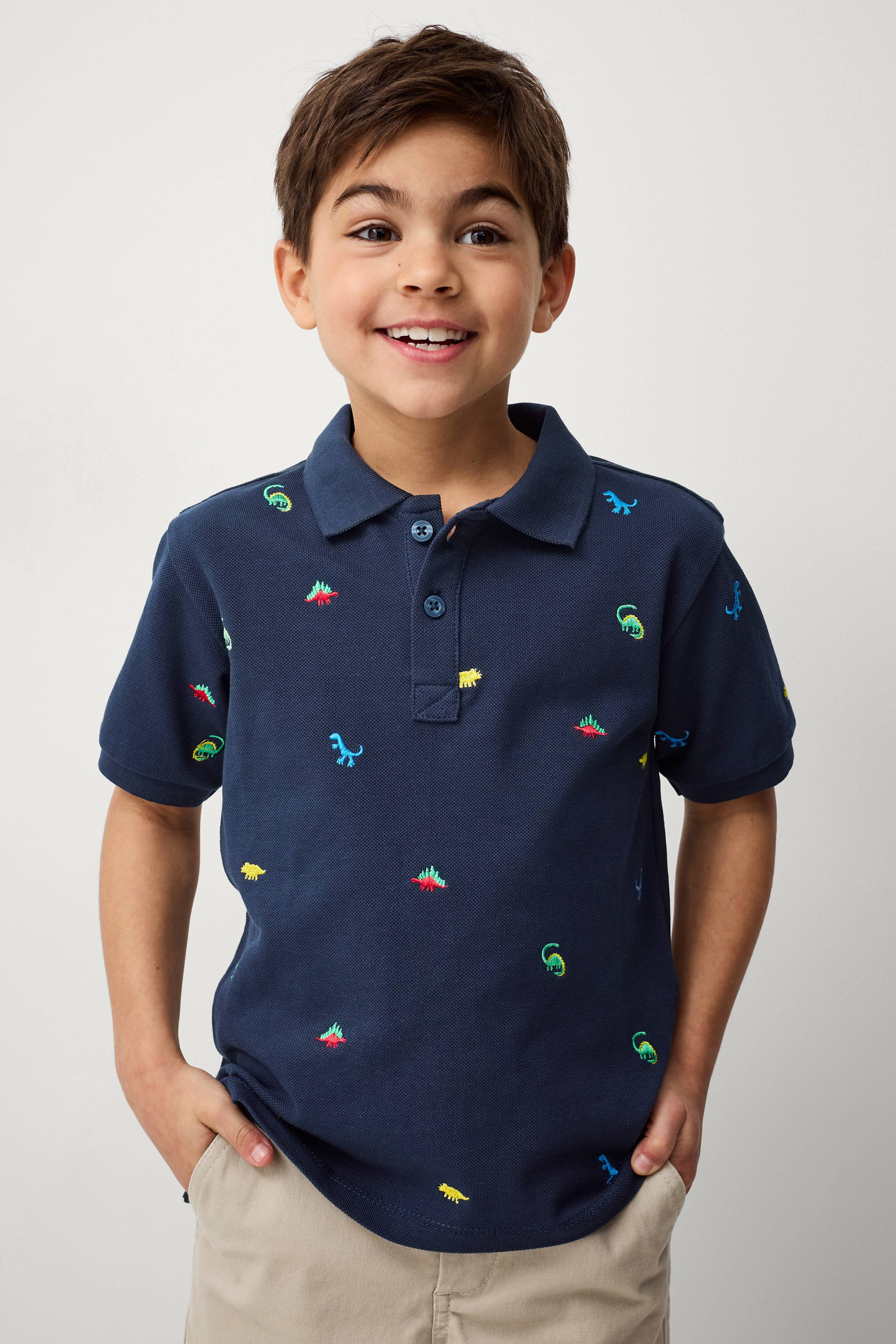 • Klassisk pologenser• Ribbet krage• To knapper• Korte ermer med ribbede kanter• Broderte biler rundt• Ventilasjon nede i sidene