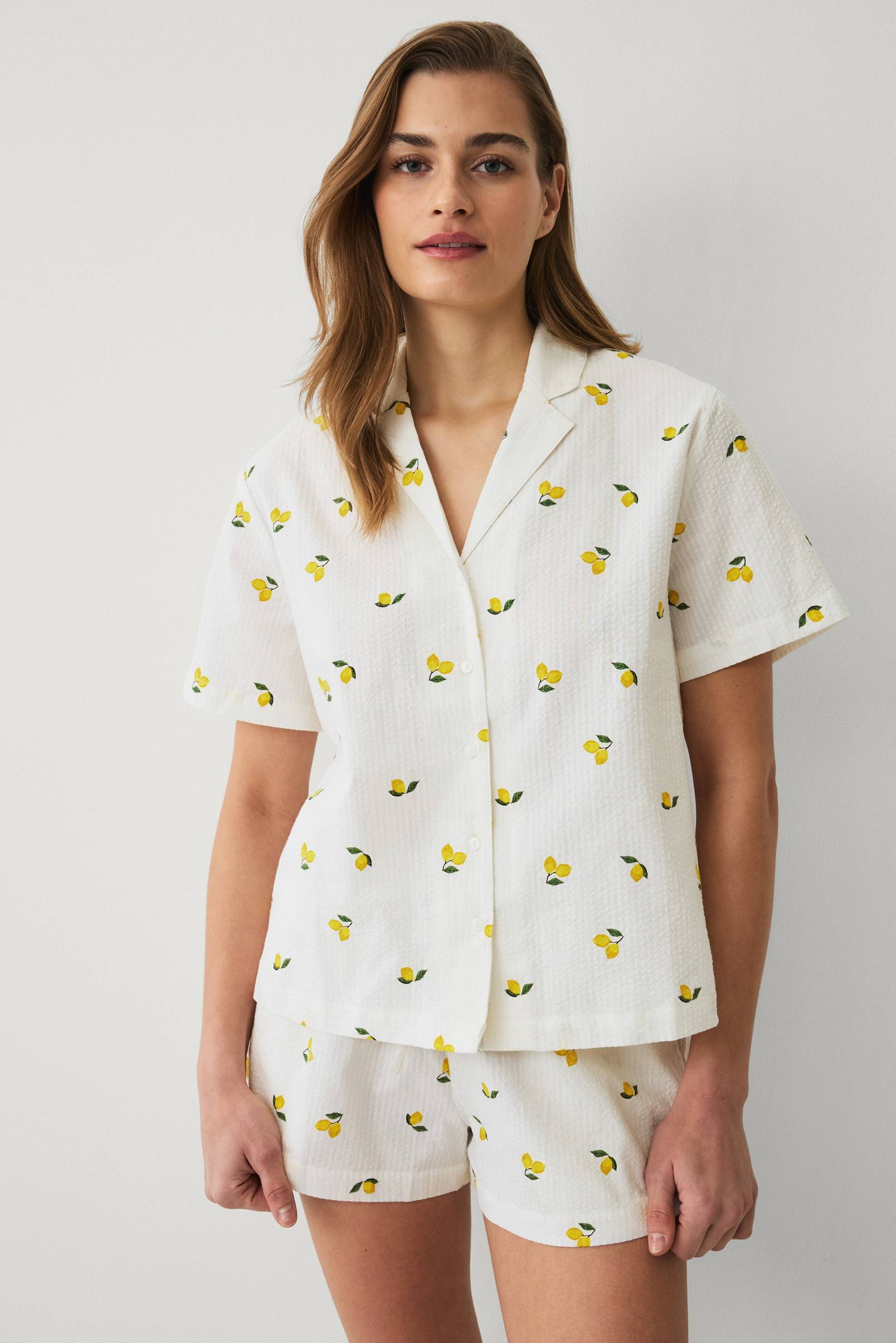• Pysjsett i seersuckerstoff med boblet struktur• Trykkede hjerter rundt• Kortermet skjorte med v-hals snitt og knapper• Shorts med elastisk midje og snøring• Sidelommer• Skjortelengde: 63 cm i størrelse S