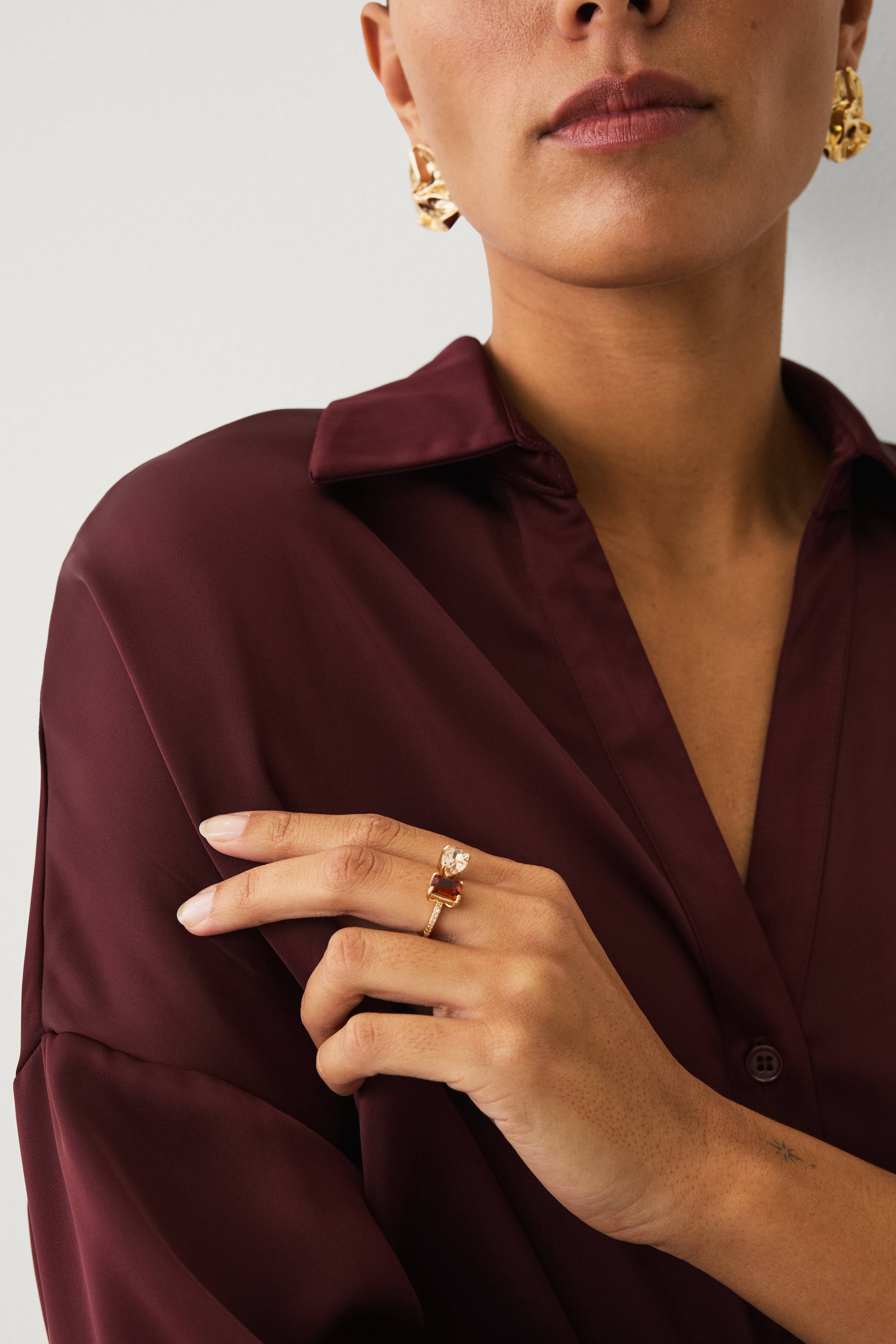 • Ring med en dråpeformet stein og en firkantet stein• Små rhinstener på sidene av ringen