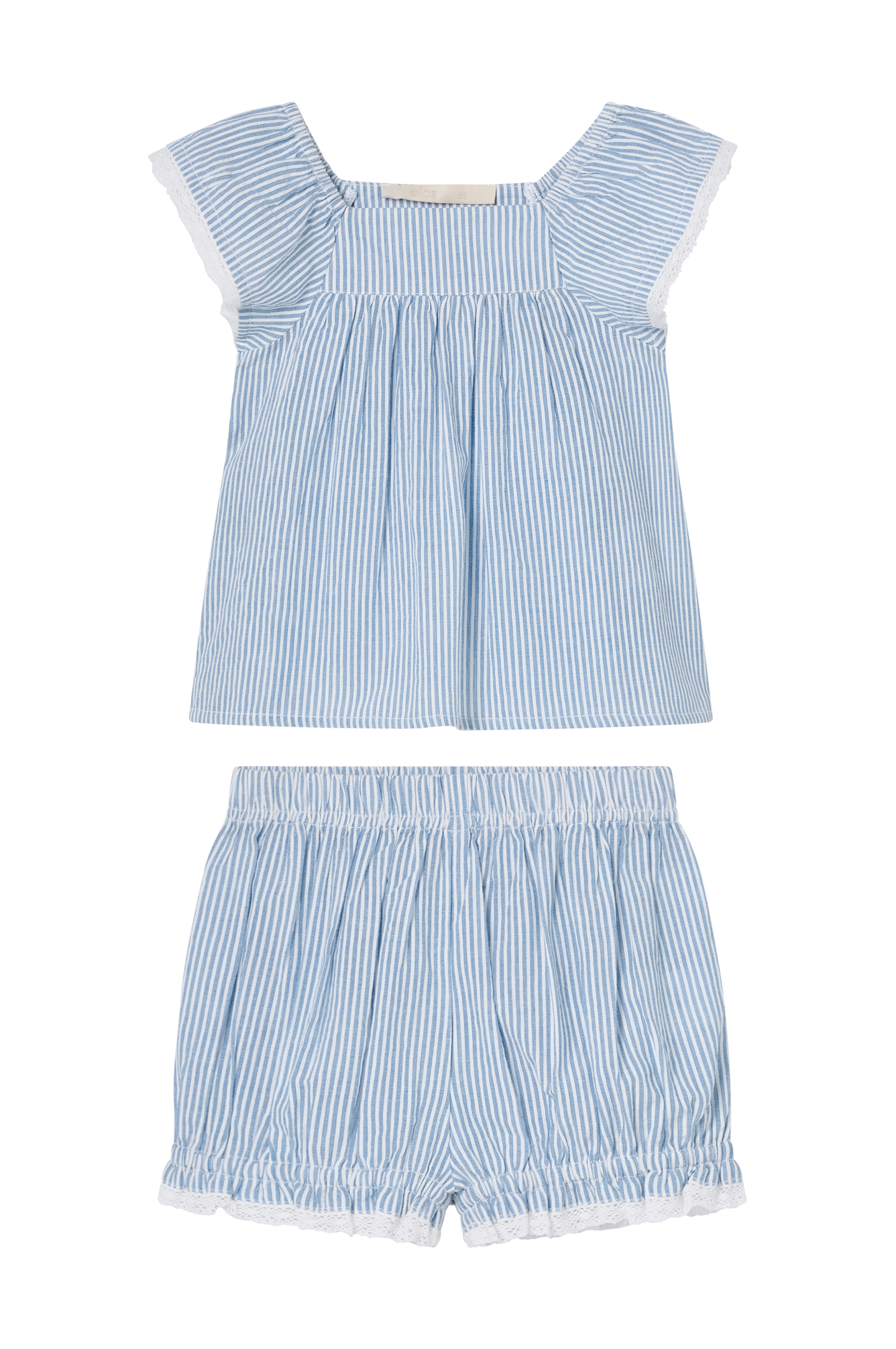 • 2-delt sett i bomull med blondekanter• Ermløs, utsvingt topp• Elastiske skulderstropper med volanger• Kort shorts med elastisk midje• Elastiske benender med volanger