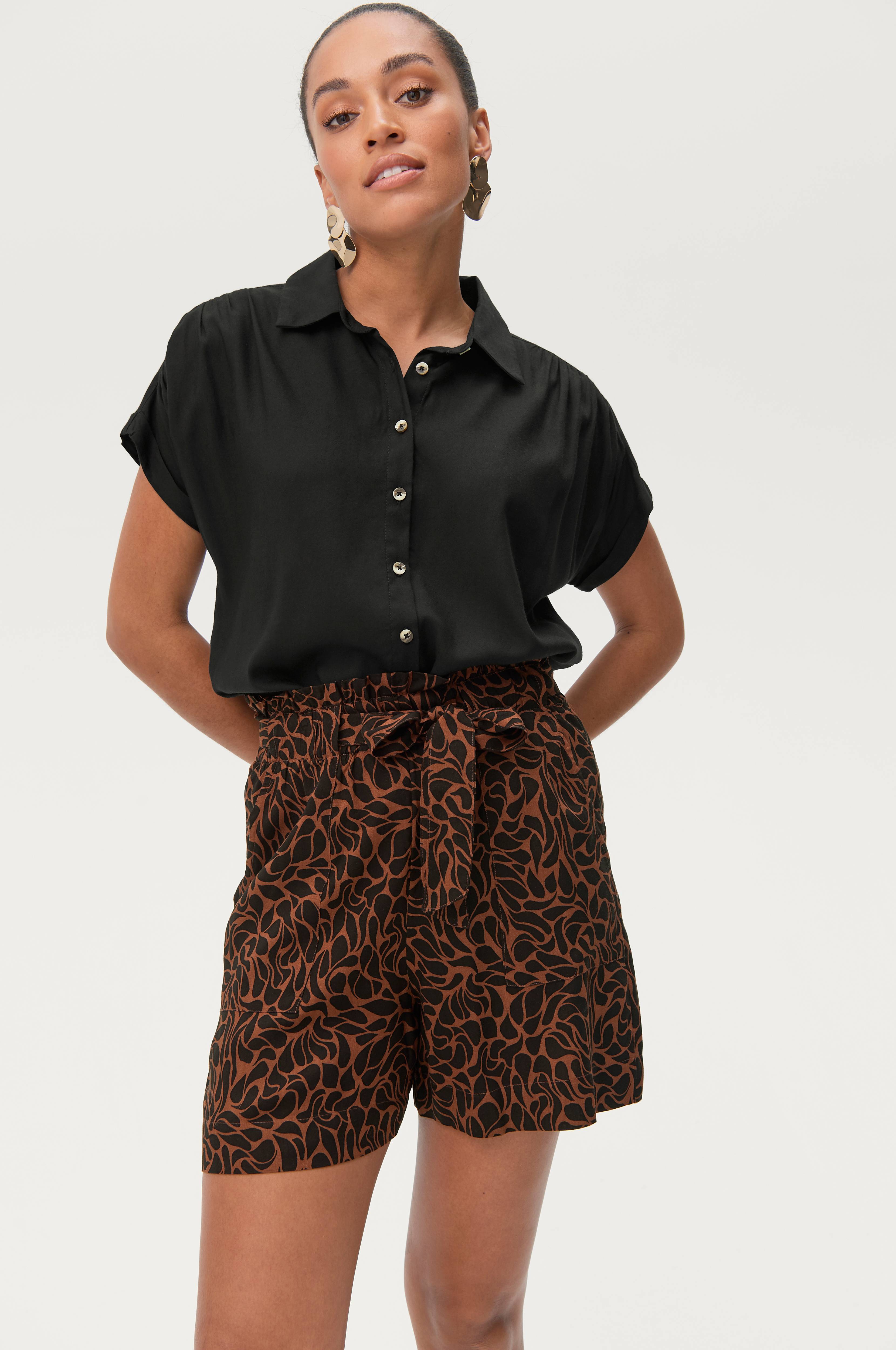 Shorts Bellina i ledig modell i myk, vevd kvalitet med høy midje. Praktisk dra på-modell med lomme i sidene, bred strikk og liten volangkant i midjen samt knytebelte. Indre benlengde ca. 13 cm i str 36.