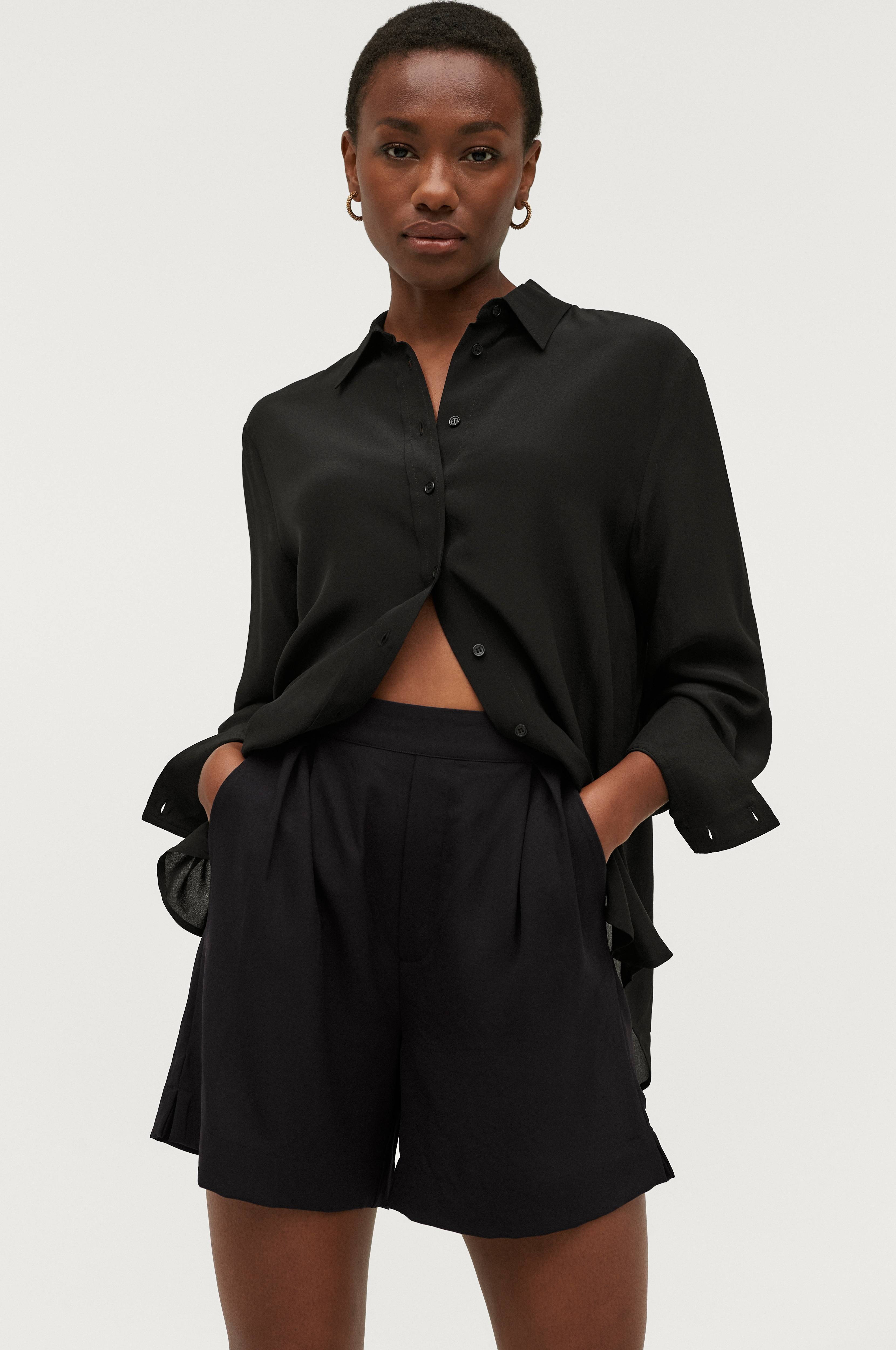 Shorts med høy midje med lagte legg foran. Lomme i sidene og rynket strikk bak i midjen. Dekorsydd gylf. Fremstilt i vevd kvalitet.