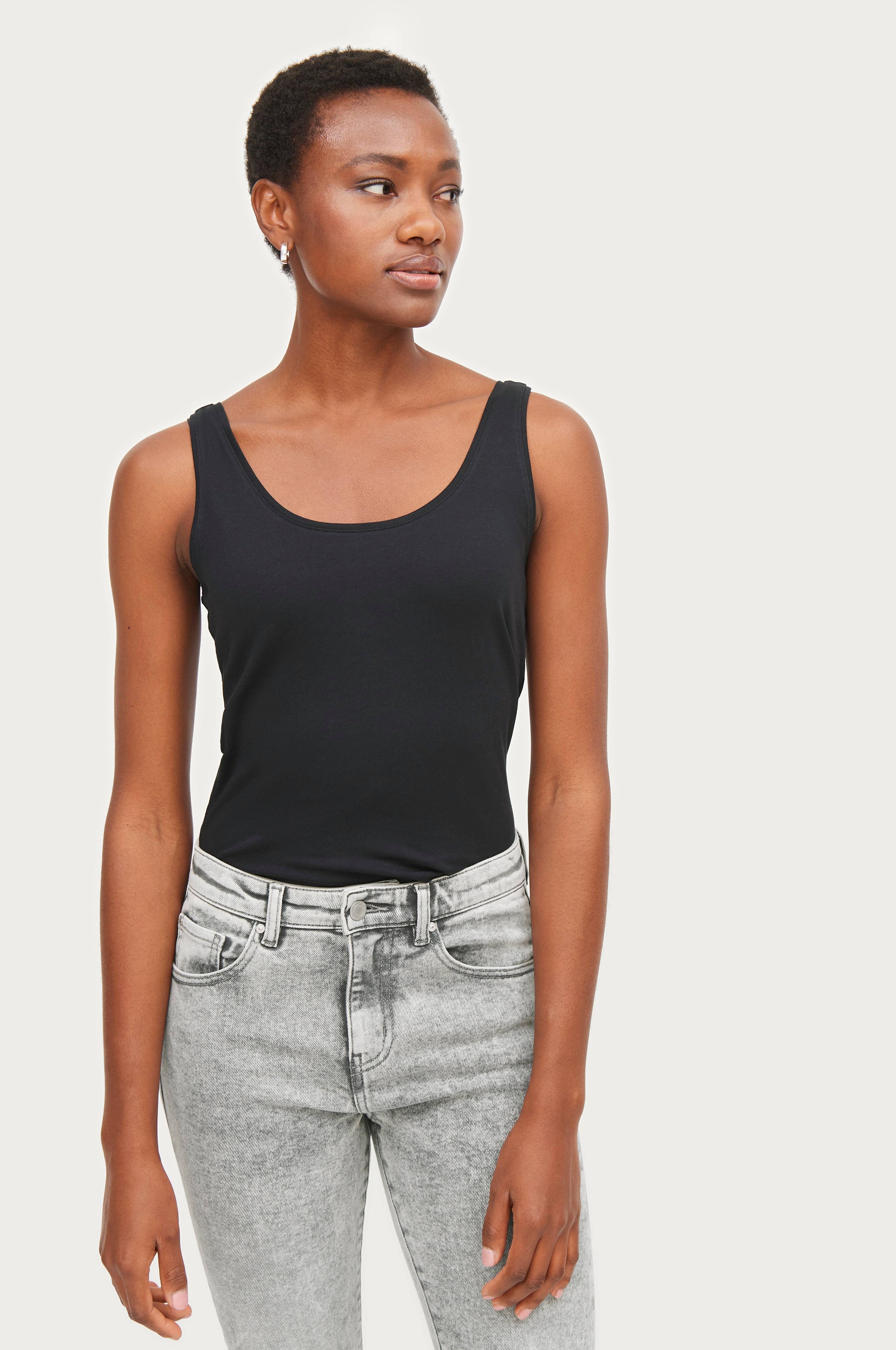 Singlet Anna 2-pk i myk trikot av økologisk bomull. Herlig basistopp med smal vrangbord i halsen og langs ermehullene. Lengde ca. 67 cm i str 34/36.