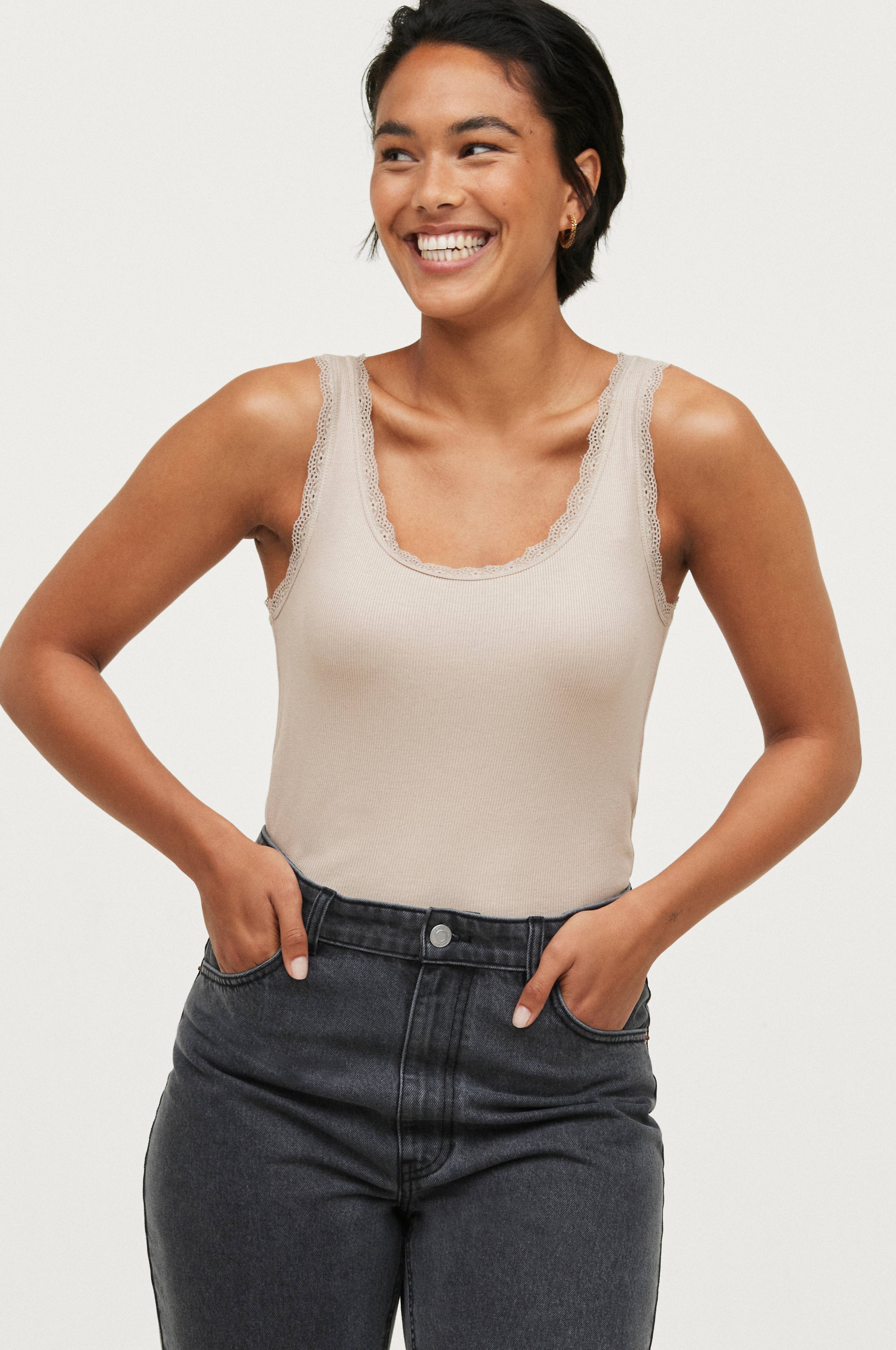 Singlet Caren i myk, ribbestrikket viskosetrikot med blonde langs halsringningen og ermeåpningene. Smal passform. Lengde ca. 66 cm i str 34/36.