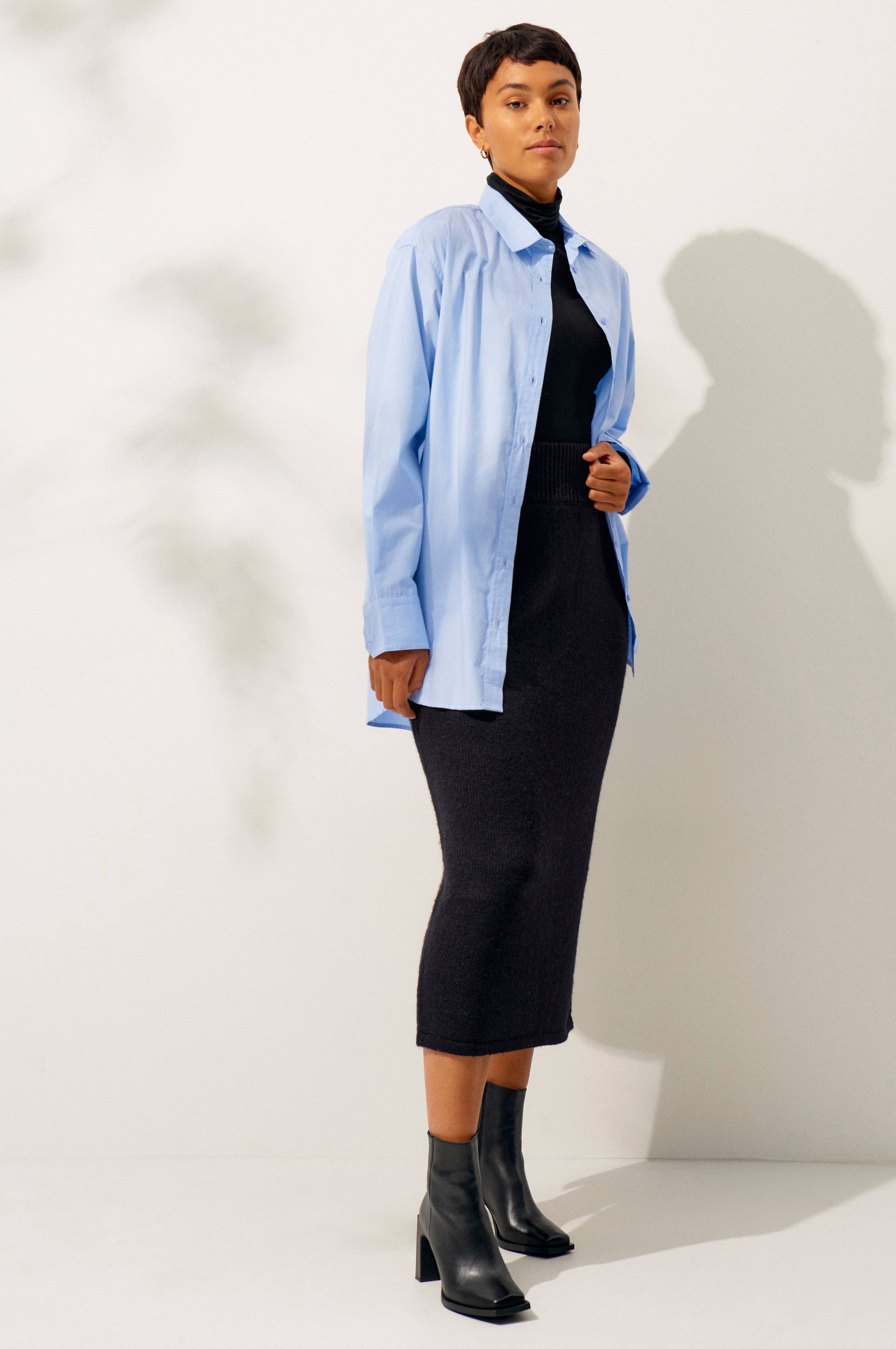 Nydelig strikket skjørt i myk kvalitet. Komfortabel bred elastikk i midjen og spaltet bak som lar deg gå i den uten å «bli sittende fast». Garnet grovere så det er et ekte…