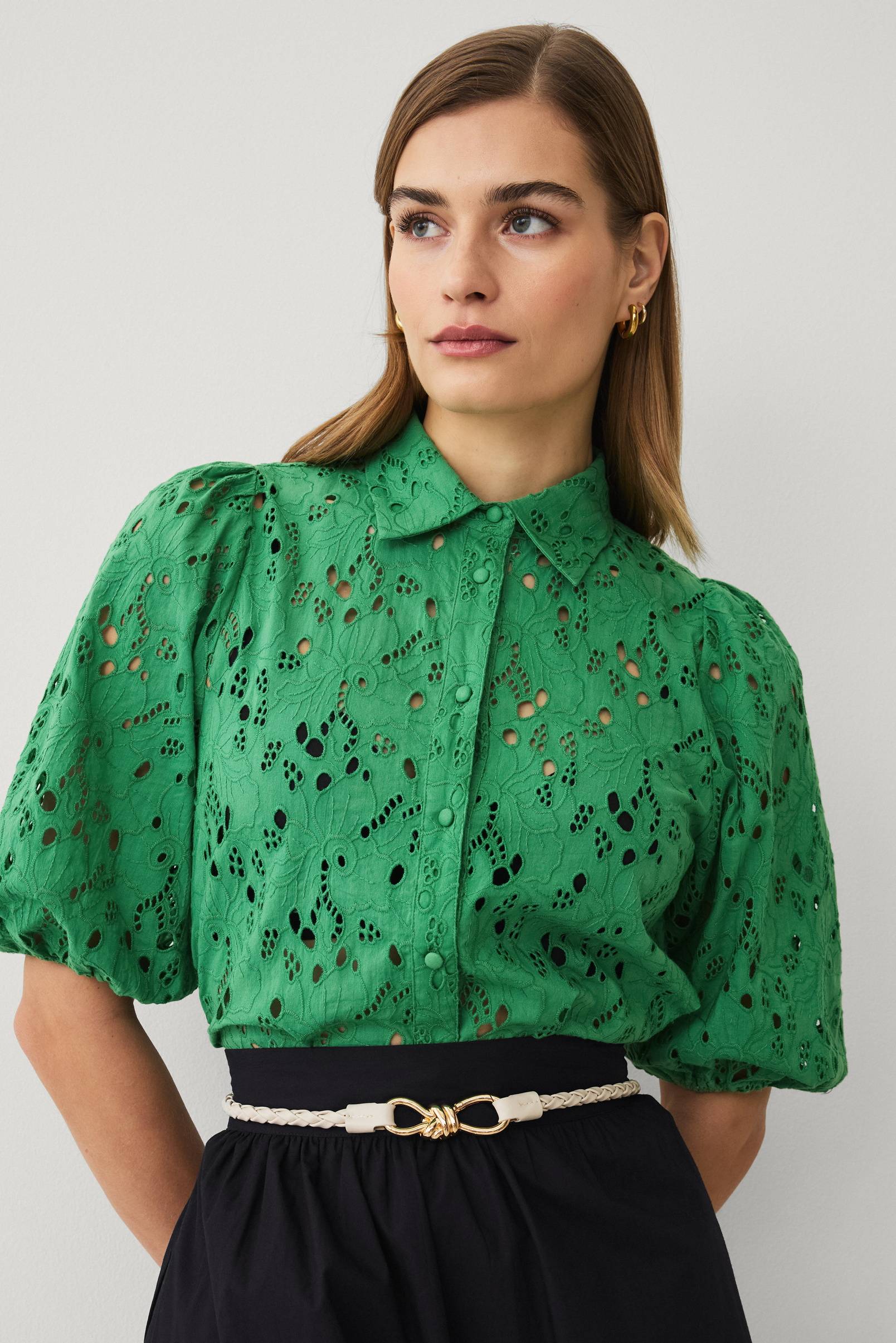 • Lett figurformet modell med hullbroderier overalt• Kledde knapper foran• Halvlang bobleerme med gummistrikk i ermeslutten• Lengde: 61 cm i størrelse 36