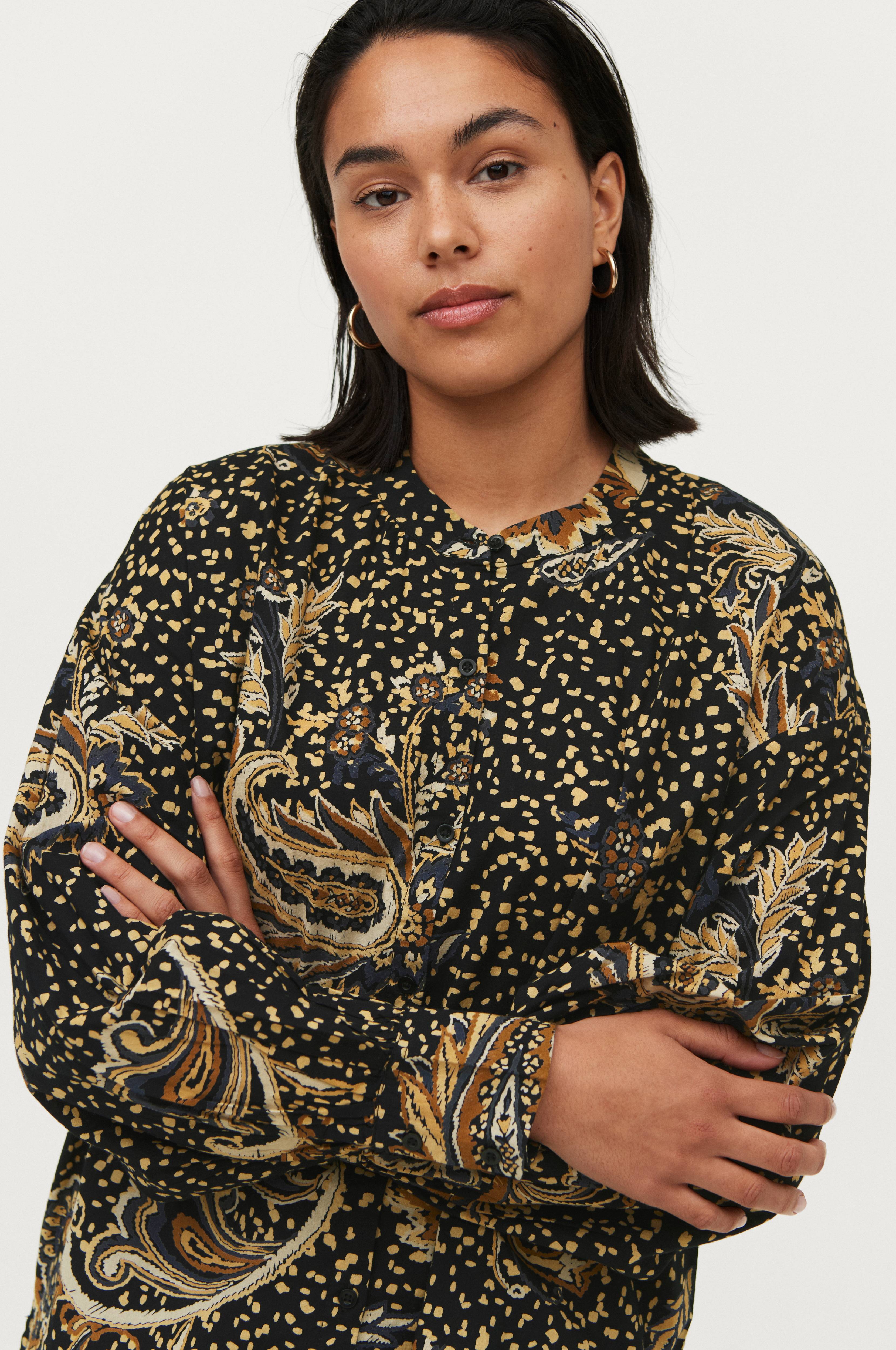 Skjorte i oversizemodell for en ledig, avslappet stil. V-utringet foran og lave skuldersømmer. Avrundede sider med splitt nederst. Skjorten er lengre bak. Lengde foran ca. 72 cm i str 34/36.