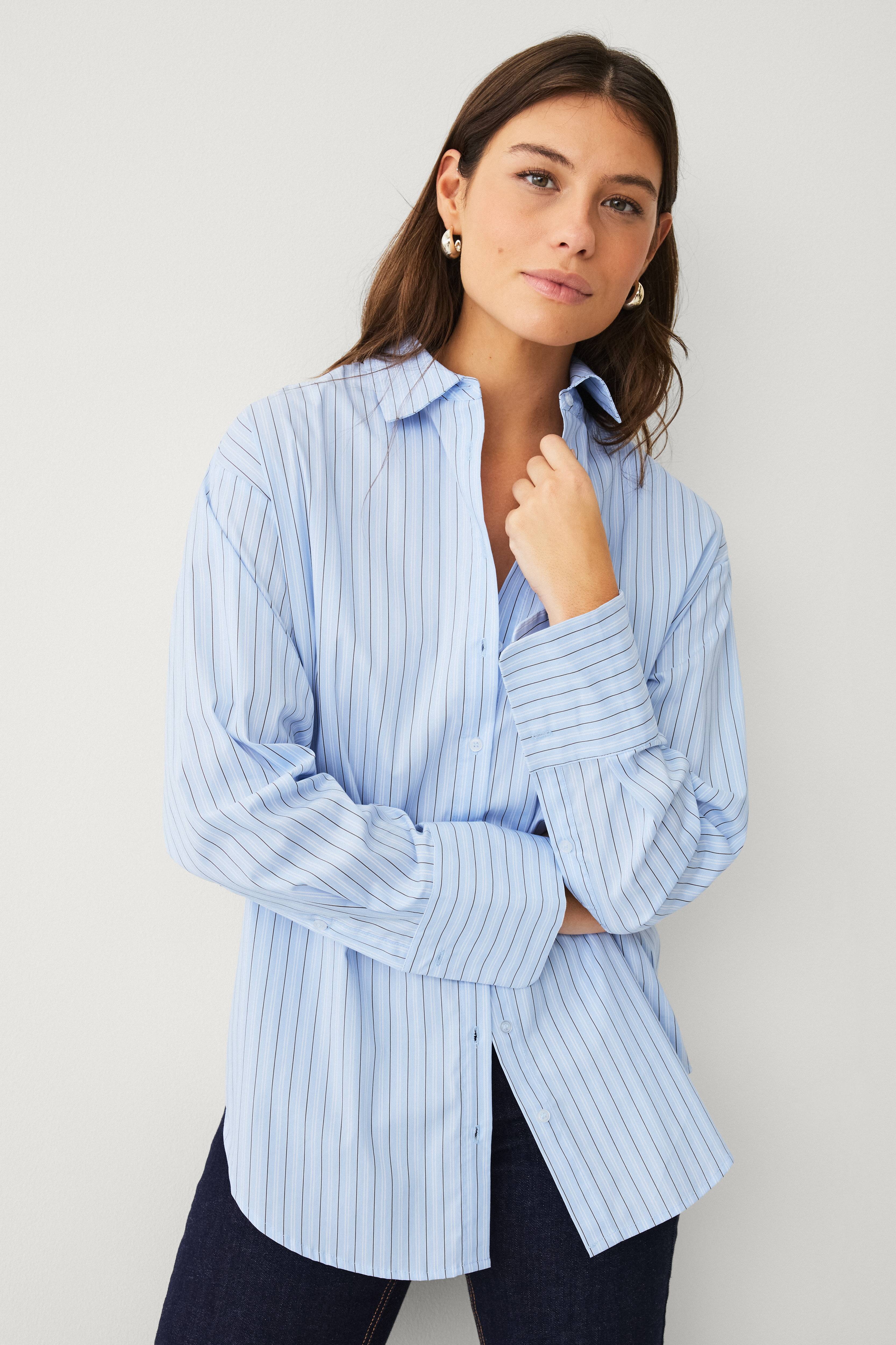• Stripete skjorte med løs passform• Skjortekrage• Avrundet hem• Lange armer med bred mansjett og to knapper• Lukking foran med dekorative knapper• Lengde: 79 cm i størrelse S