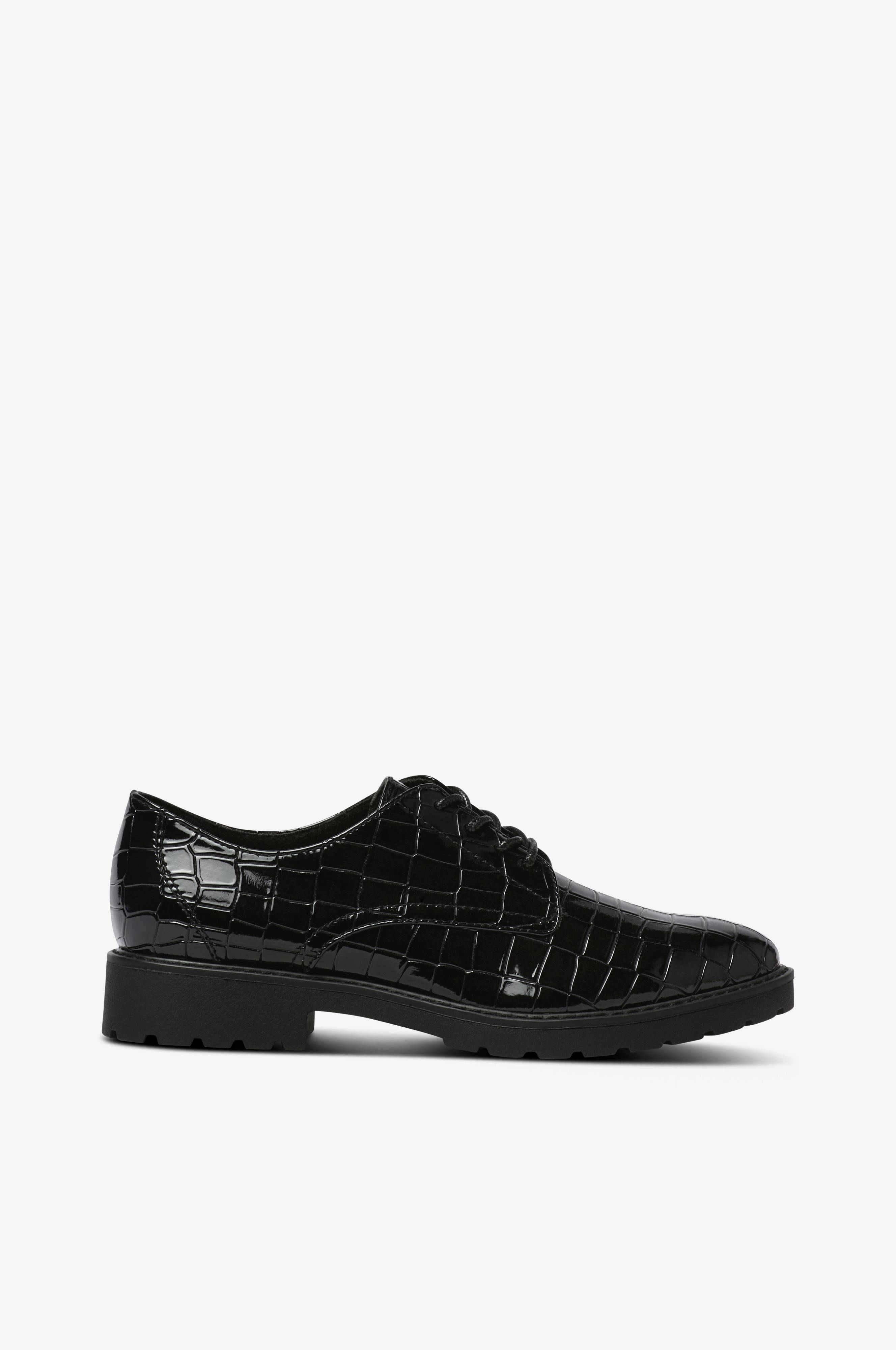 Lave snøresko i krokopreget skinnimitasjon med litt grov såle.Mykt fôr i velur.
