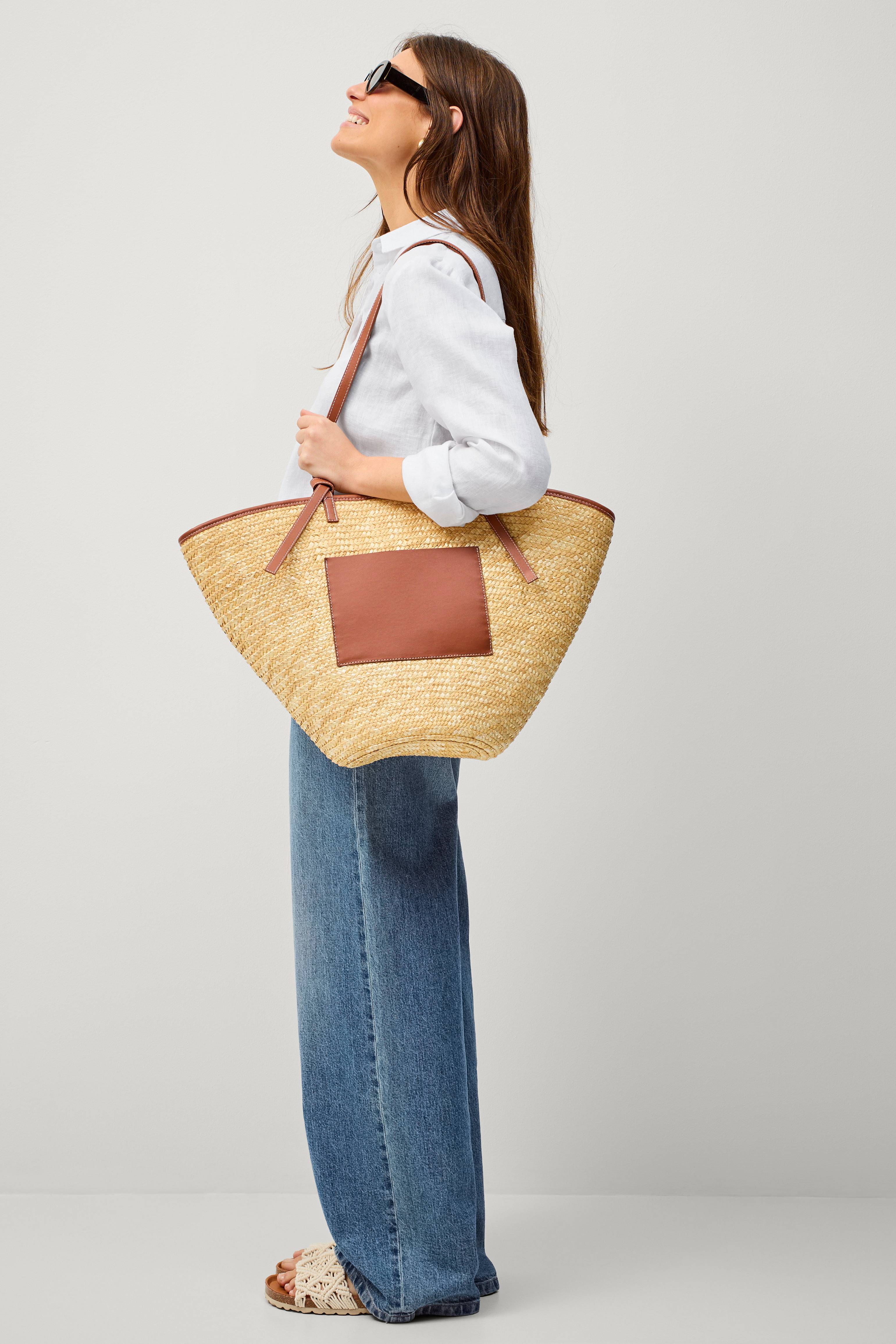 • Flettet stråveske med detaljer i skinnimitasjon• Utvendig, åpen lomme• To bærestropper• Mål: B 47 x H 35 x D 13 cm