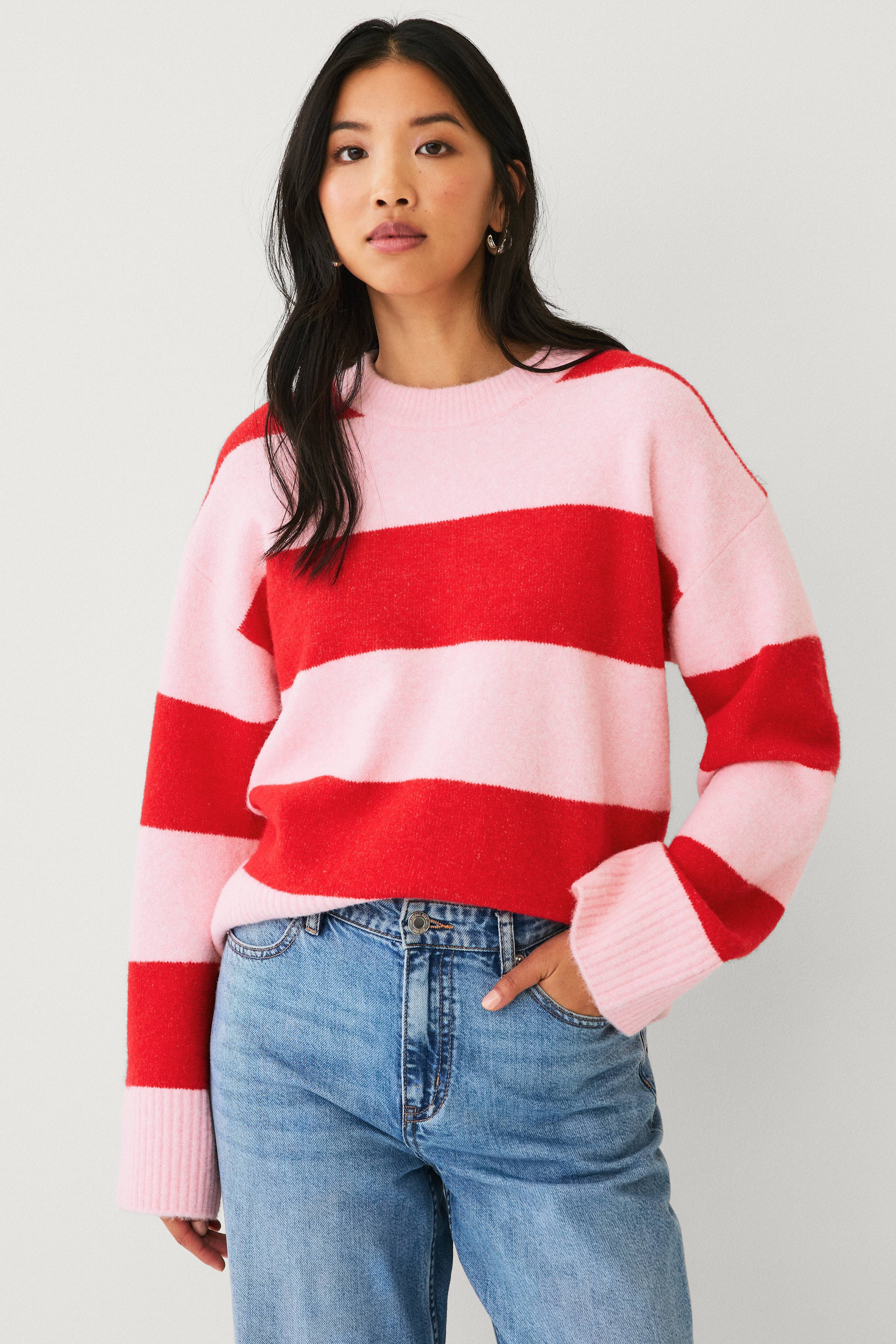 • Stripete, finstrikket genser• Rund, ribbet hals• Lange, utsvingte ermer med bred ribbestrikk i ermeslutten• Bred ribbestrikk i nedre kant