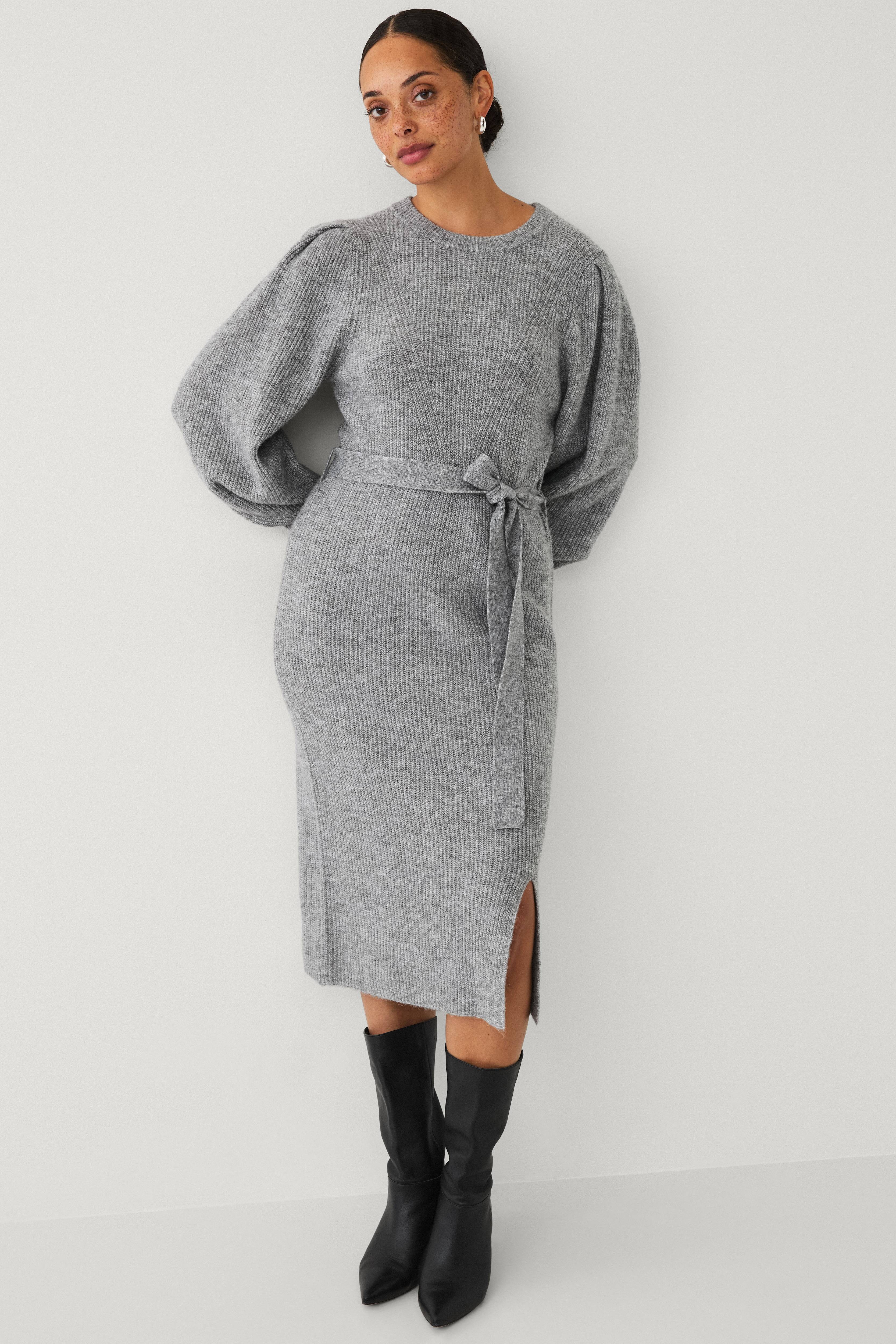 • Myk, stretchy strikketkjole • Rund hals • Lange ballongermer • Avtakbart knytbart belte ved midjen • Splitt nedover foran • Normal passform • Lengde: 112 cm i størrelse S