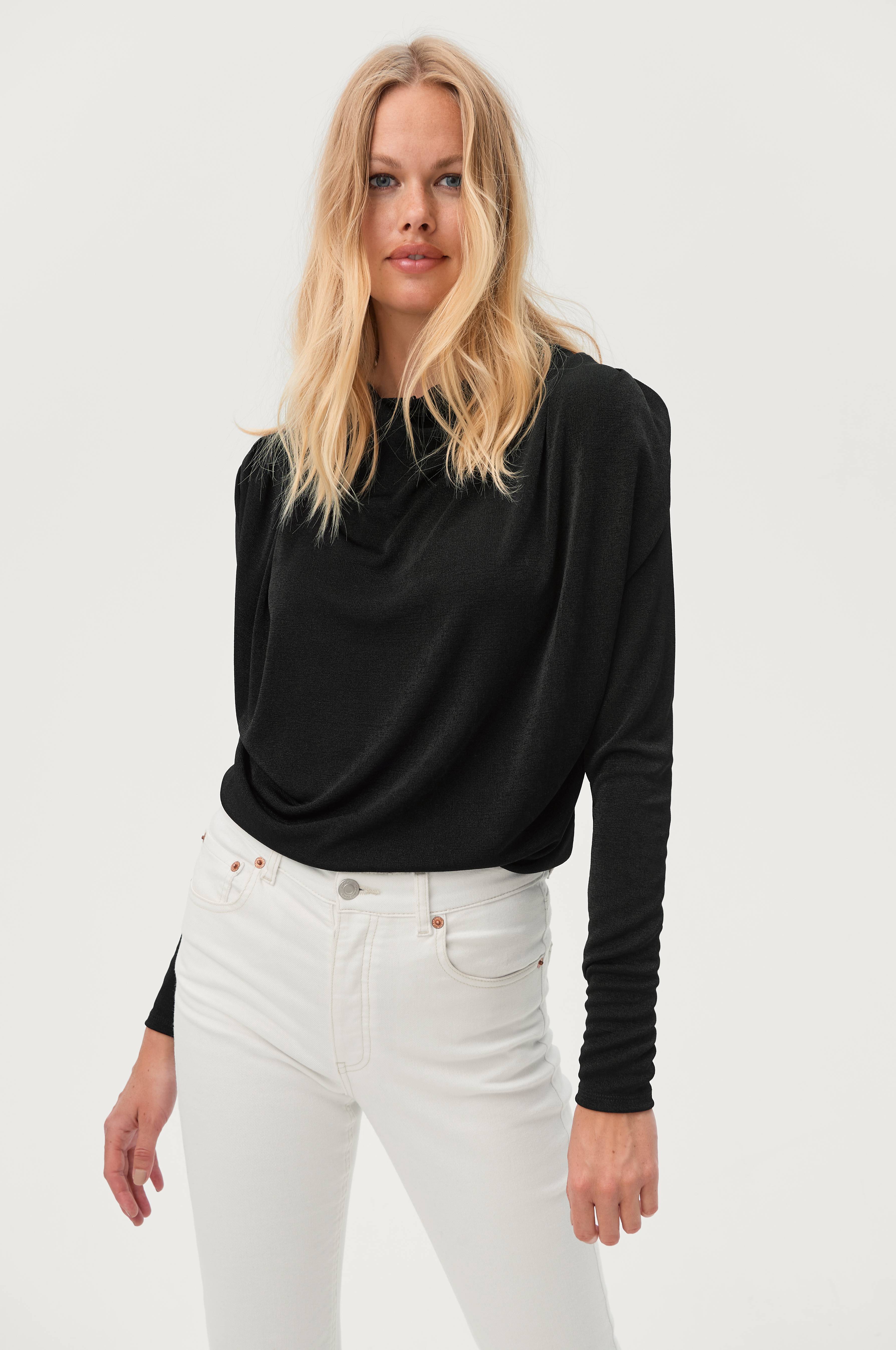 Topp Celie med drapert hals og lagte draperingslegg foran på skuldrene samt lange, smale ermer. Stretchtrikot med glans. Lengde ca. 64 cm i str 34/36.