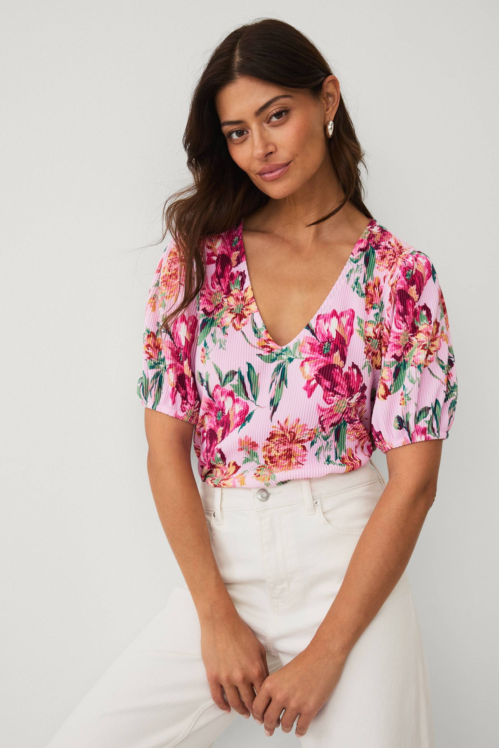 • Topp i plissert tricot• V-hals snitt• Korte bobleermer• Lengde: 57 cm i størrelse S