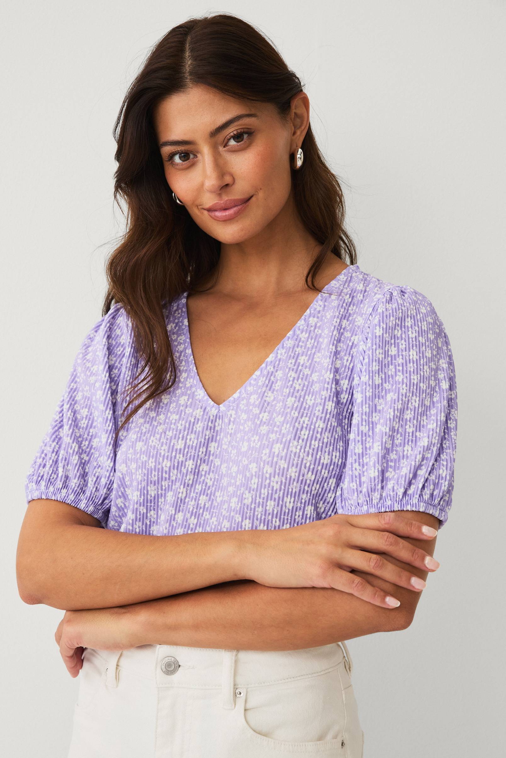 • Topp i plissert tricot• V-hals snitt• Korte bobleermer• Lengde: 57 cm i størrelse S