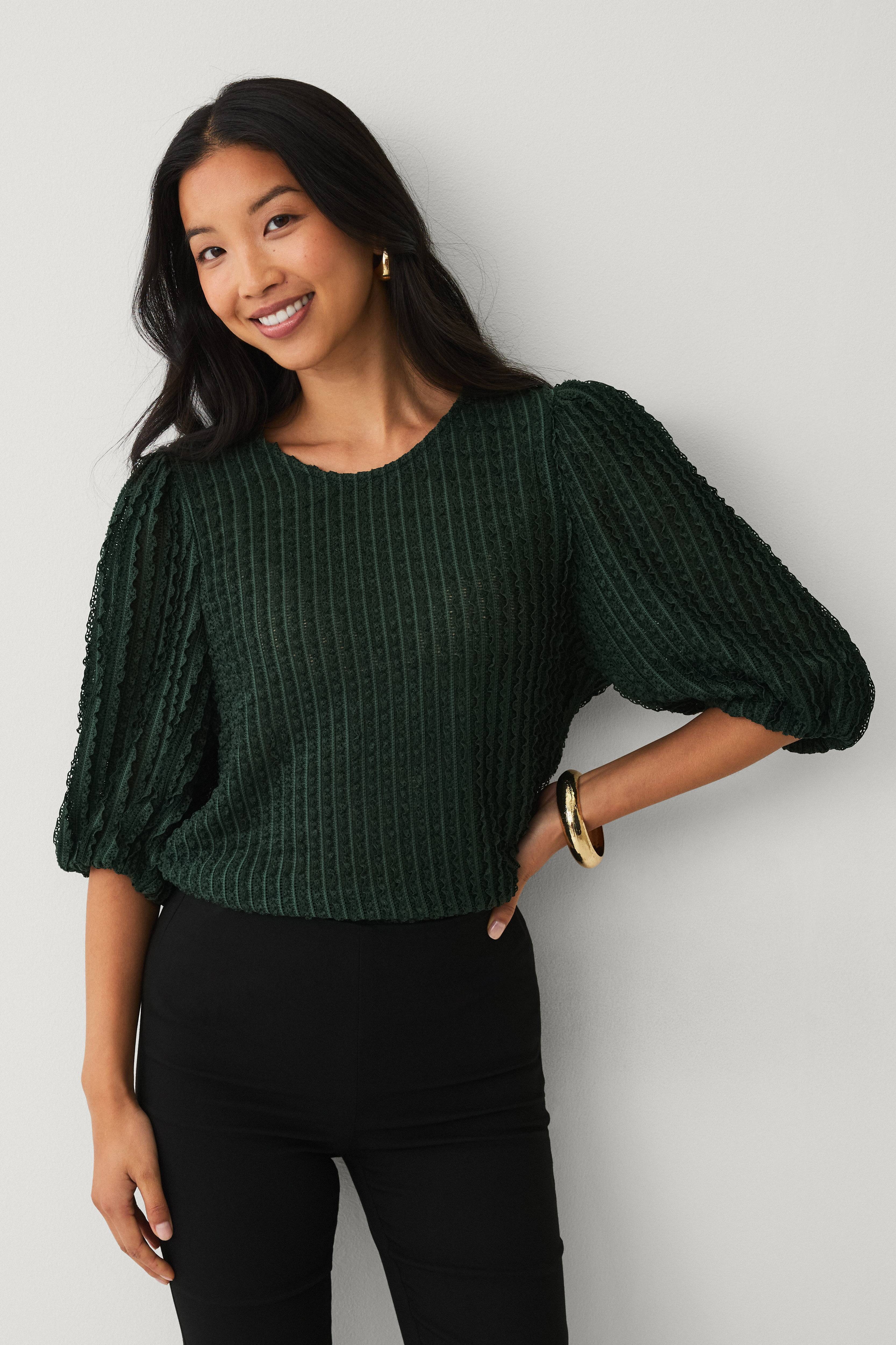 • Topp med hullmønstret, halvtransparent, stripete strukturmønster med korte volangkanter • Korte ballongermer med gummistrikk i ermeslutten • Avrundet hals • Lengde: 56 cm i størrelse S