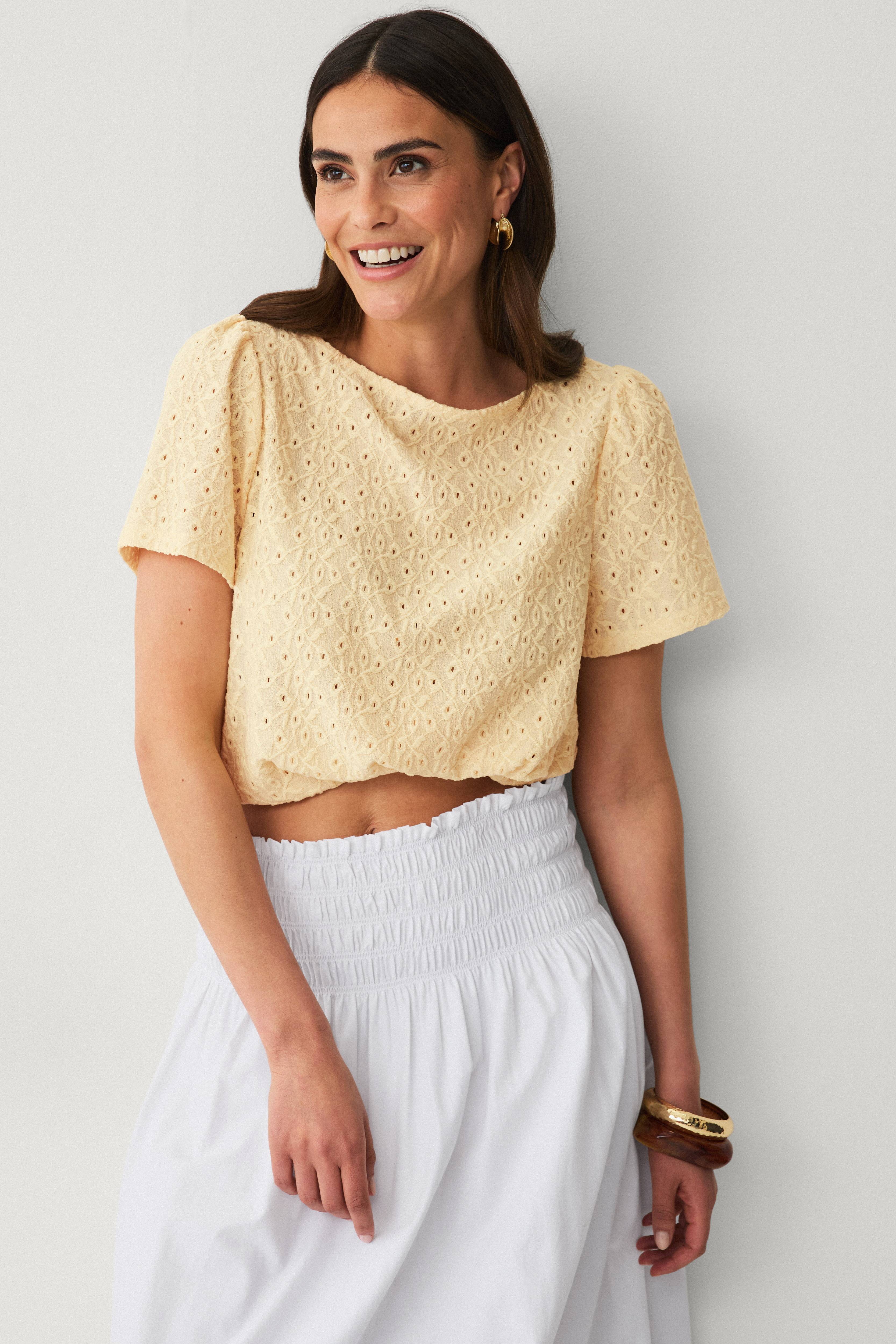 • Topp i tynt materiale med vevd struktur og hullmønster