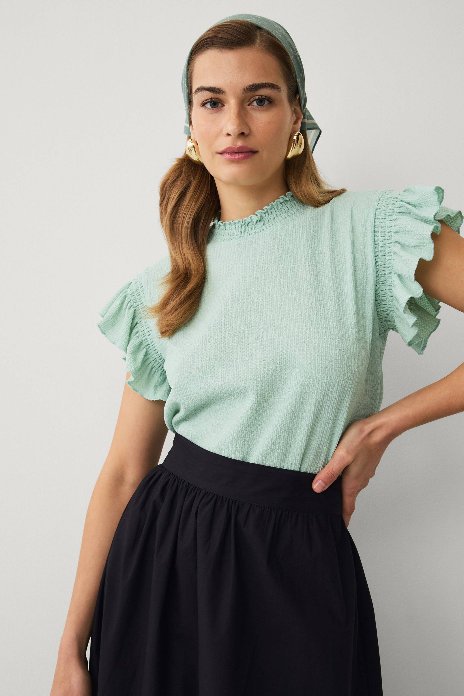 • Topp i stretchy, stukturert materiale• Kort arm med en vaffelsøm og volangdesign• Avrundet, halvhøy hals med en vaffelsøm og liten volangkant• Lengde: 58 cm i størrelse s