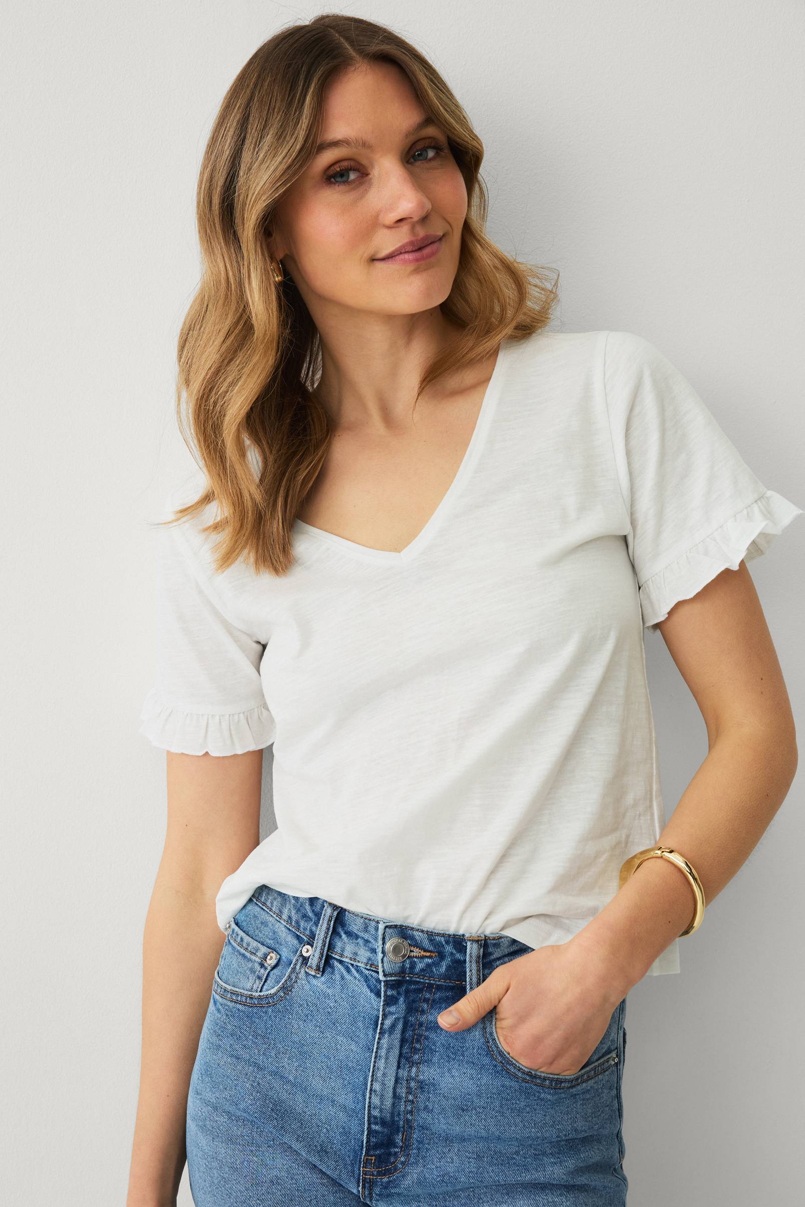 • Topp i mønstret bomullsjersey• Korte ermer med volangkant• V-hals snitt• Lengde: 58 cm i størrelse S
