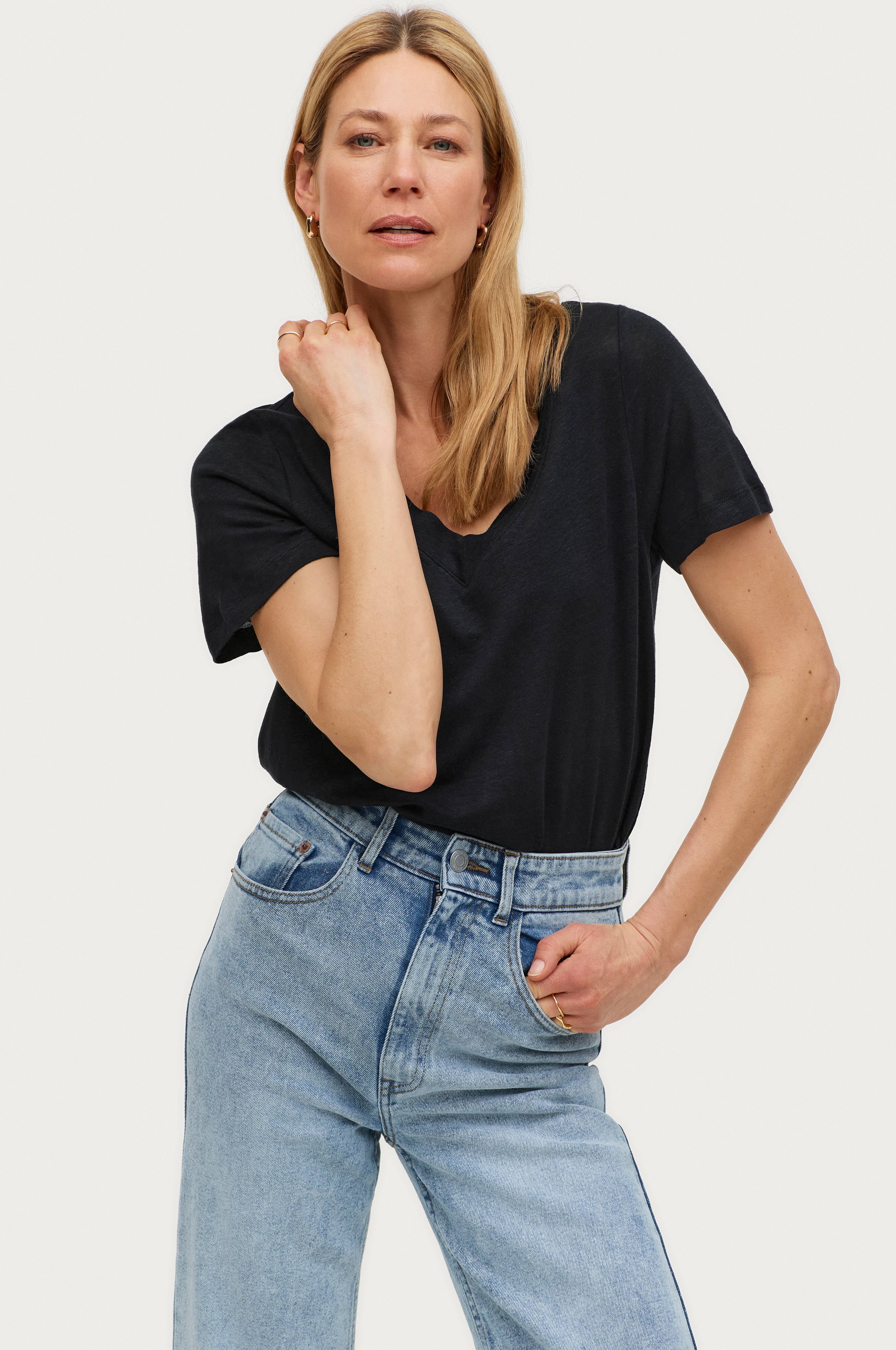 Linnetop som fungerer hele året. Stilig og rett dyp v-hals.