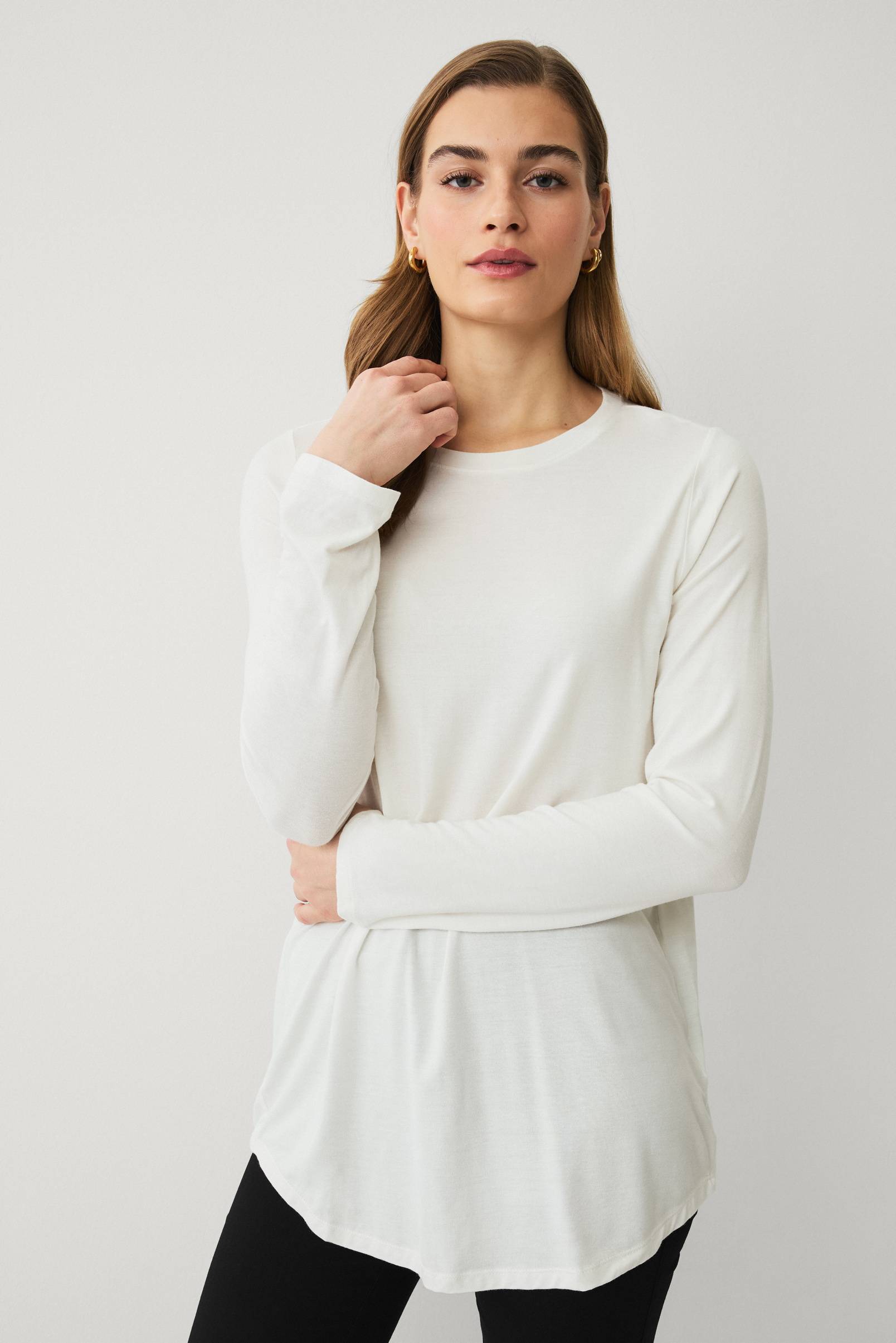 • Rett modell• Rund hals med liten kant• Langt erme• Avrundet hem• Lengde: 77 cm i størrelse 34/36