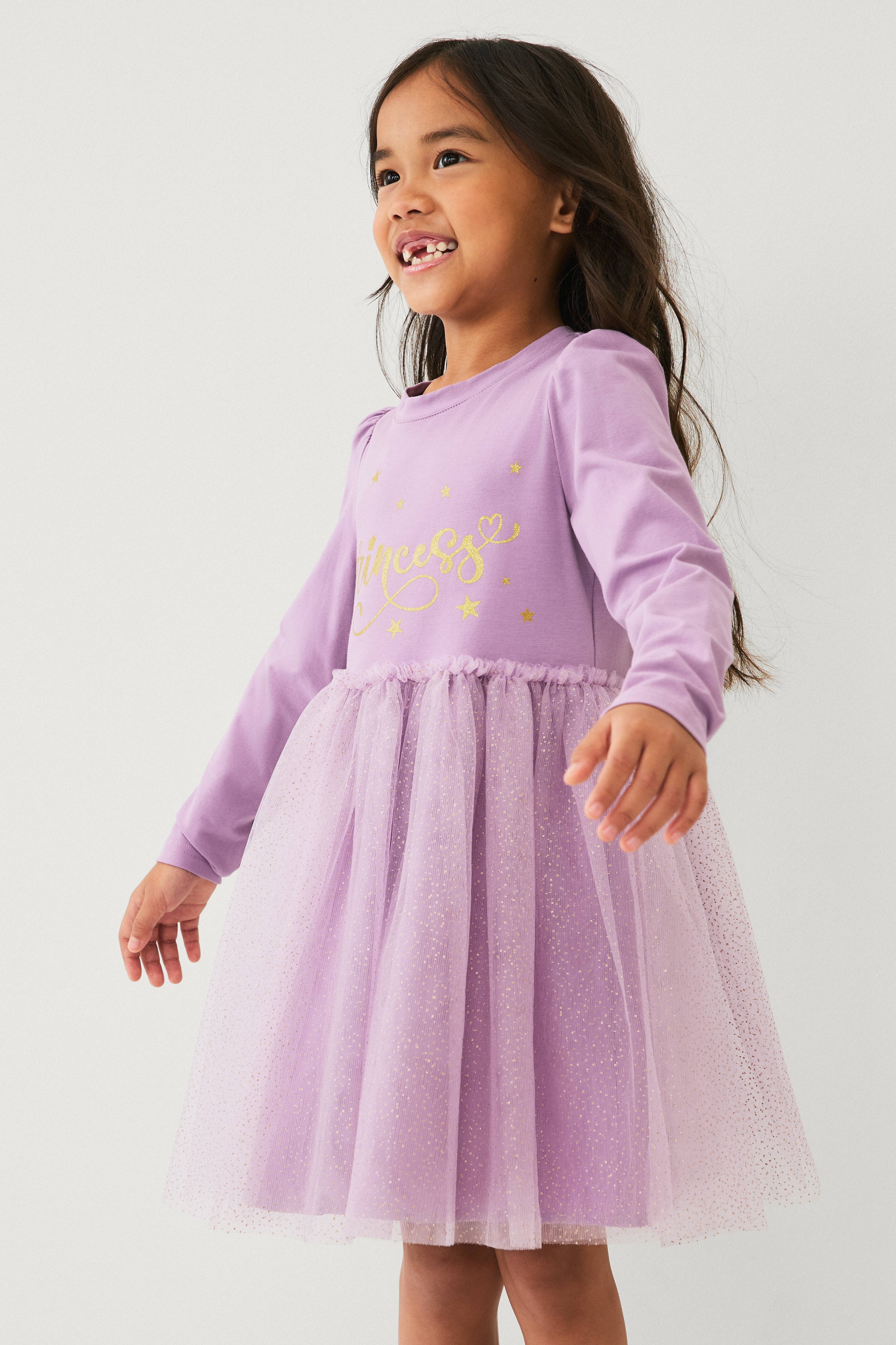 • Langermet kjole med øvre del i stretchy jerseystoff• Rund halsringning• Tyllskjørt• Vevd underskjørt