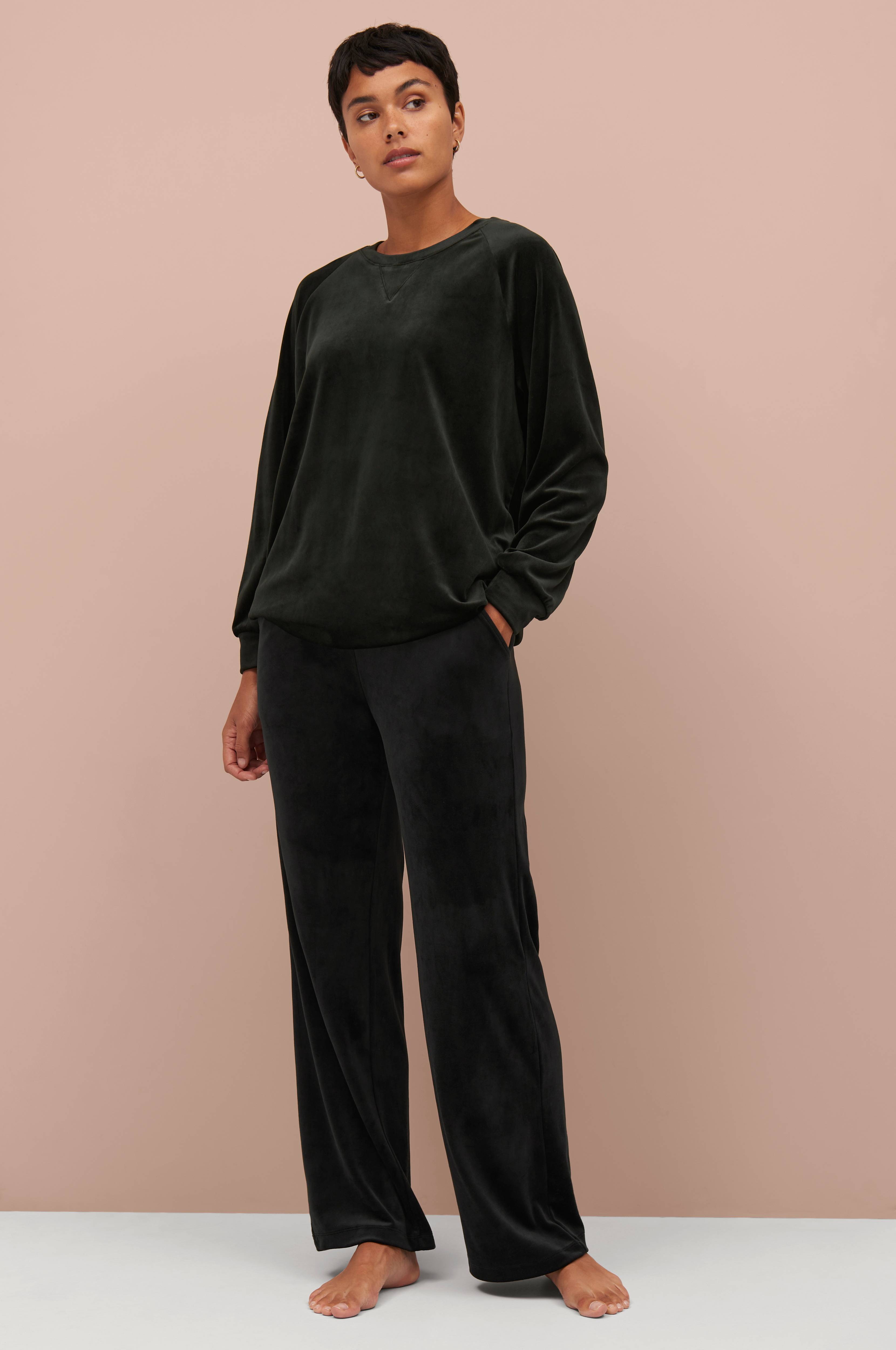 Vakker svart fløyels overflate på buksene. Avslappende og komfortable, bildene samsvarer med produktet. Størrelsene er normale, kanskje heller litt romslige enn trange.