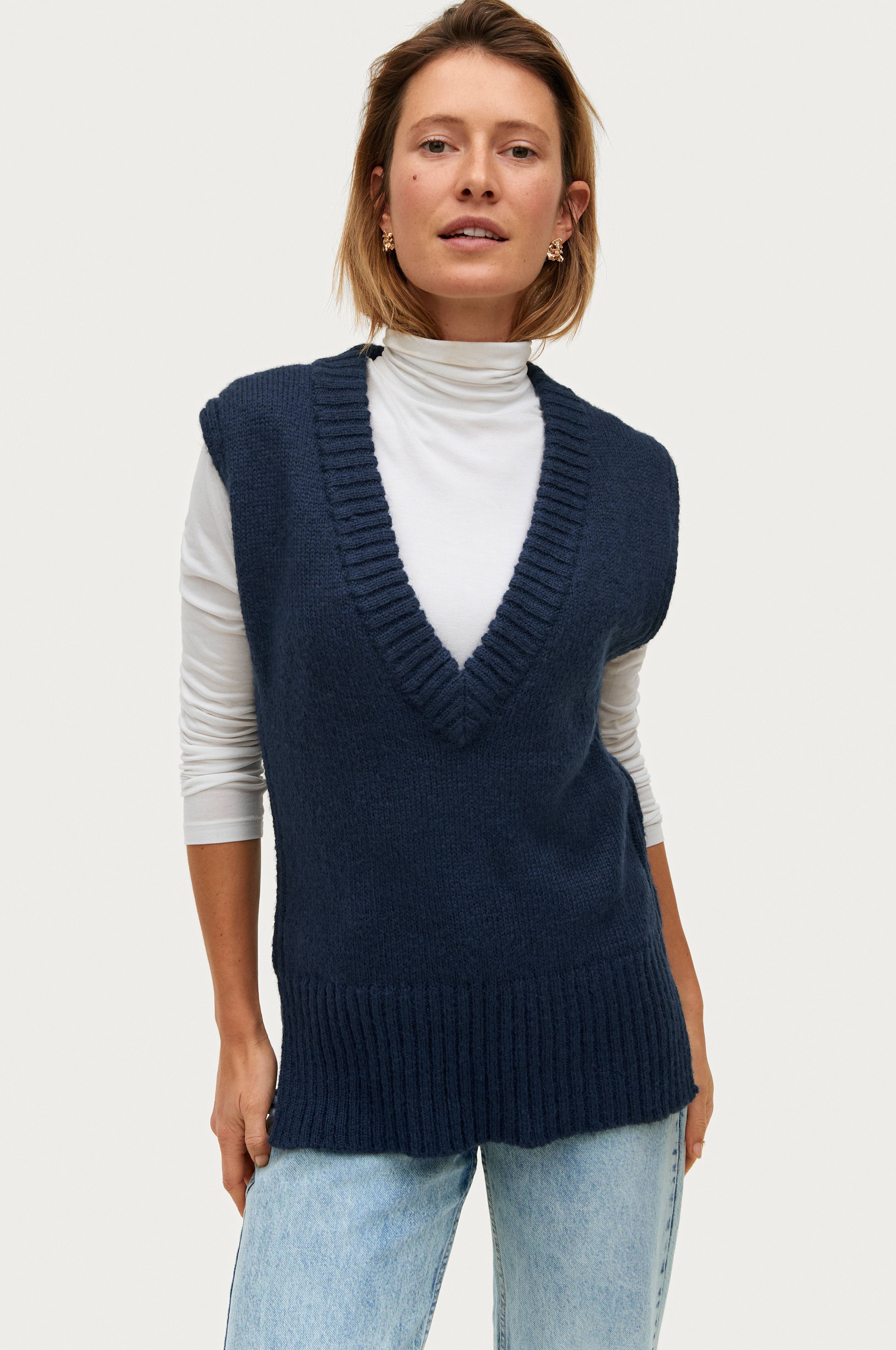 • Strikket vest i ullmiks• V-formet, ribbet hals• Ventilasjon nede i sidene• Ribbet hem• Lengde: 70 cm i størrelse 34/36