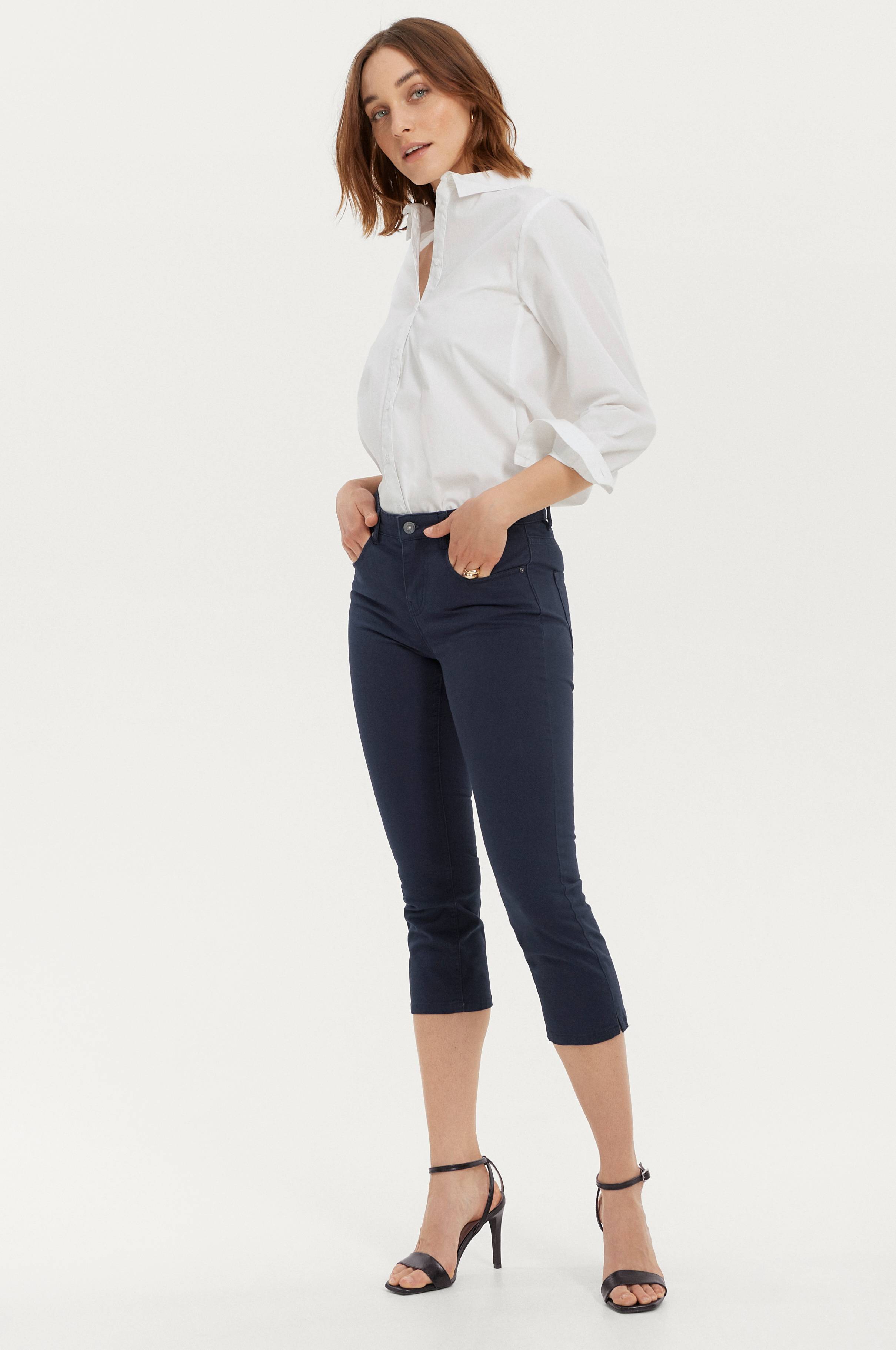 Capribukse i vevd, myk stretchtwill med normalhøy midje, smal passform og smale ben. Femlommersmodell med nagledekor på lommene foran. Linning med hemper og knapp samt gylf med glidelås. Splitt i utsiden av benkantene. Indre benlengde ca. 60 cm og fotvidde ca. 35 cm i str 38.
