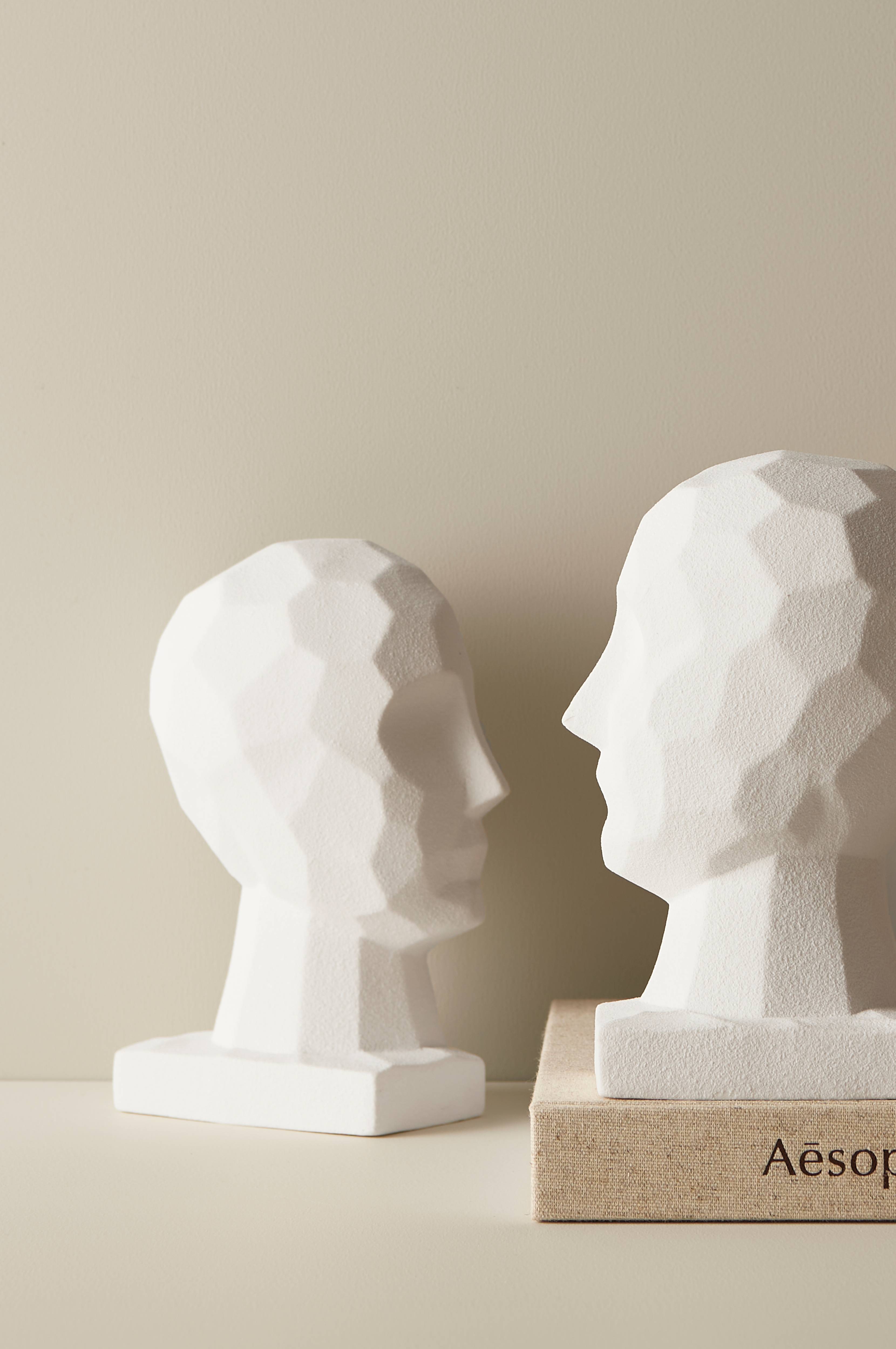 Dekorativ bokstøtte i to deler av porselen med lett, fin struktur. Mål per del: Bredde 6,5 cm, høyde 18,5 cm, dybde ca. 12,5 cm.