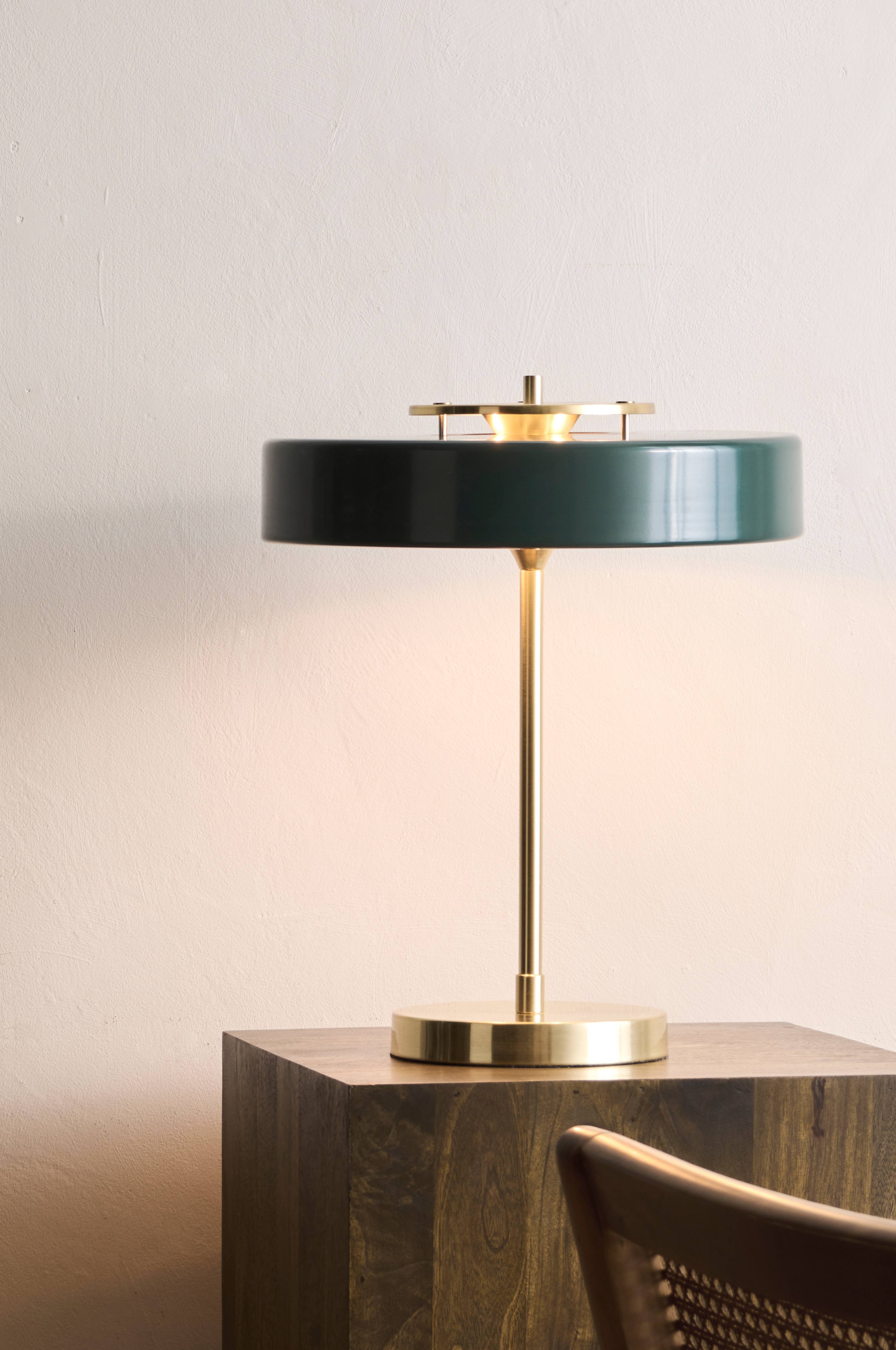 Bordlampe av metall med børstet messingfinish og skjerm i matt, malt finish. Skjermens innside er hvit. Totalhøyde 44 cm. Skjerm: Ø 35 cm, høyde 7 cm. Lampefot: Ø 18 cm. Svart plastledning med strømbryter, ledningslengde 150 cm. Sokkel 2xE14. Maks 25 W. Lyspære er ikke inkludert.