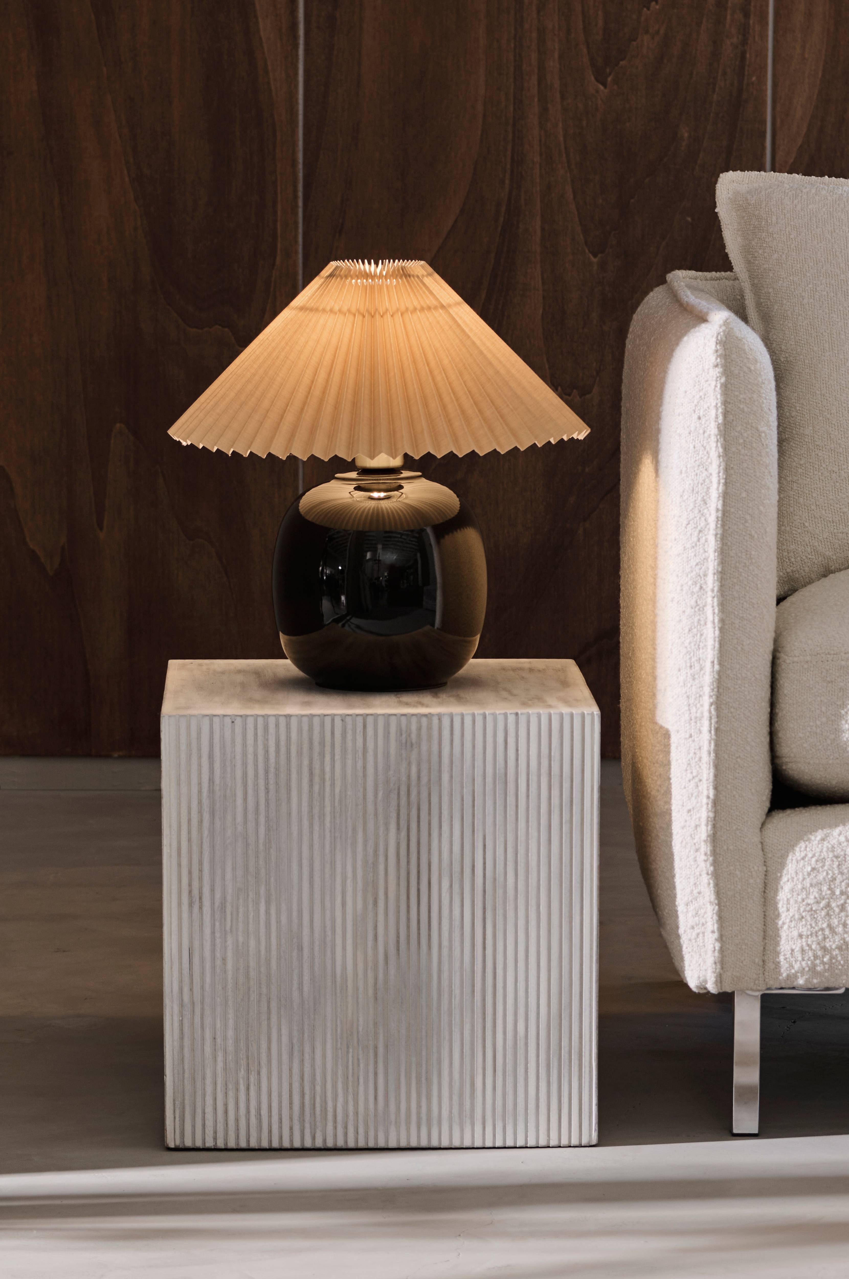 Bordlampe med fot i glasert keramikk og skjerm av plissert tekstil. Sokkelfeste av metall i antikk messingfinish. Mål på skjermen: Diameter topp 9 cm, diameter bunn 39 cm. Høyde 17 cm. Fotens mål: diameter 18 cm, høyde 18 cm. Svart tekstilkledd ledning med strømbryter. Lyspære er ikke inkludert.