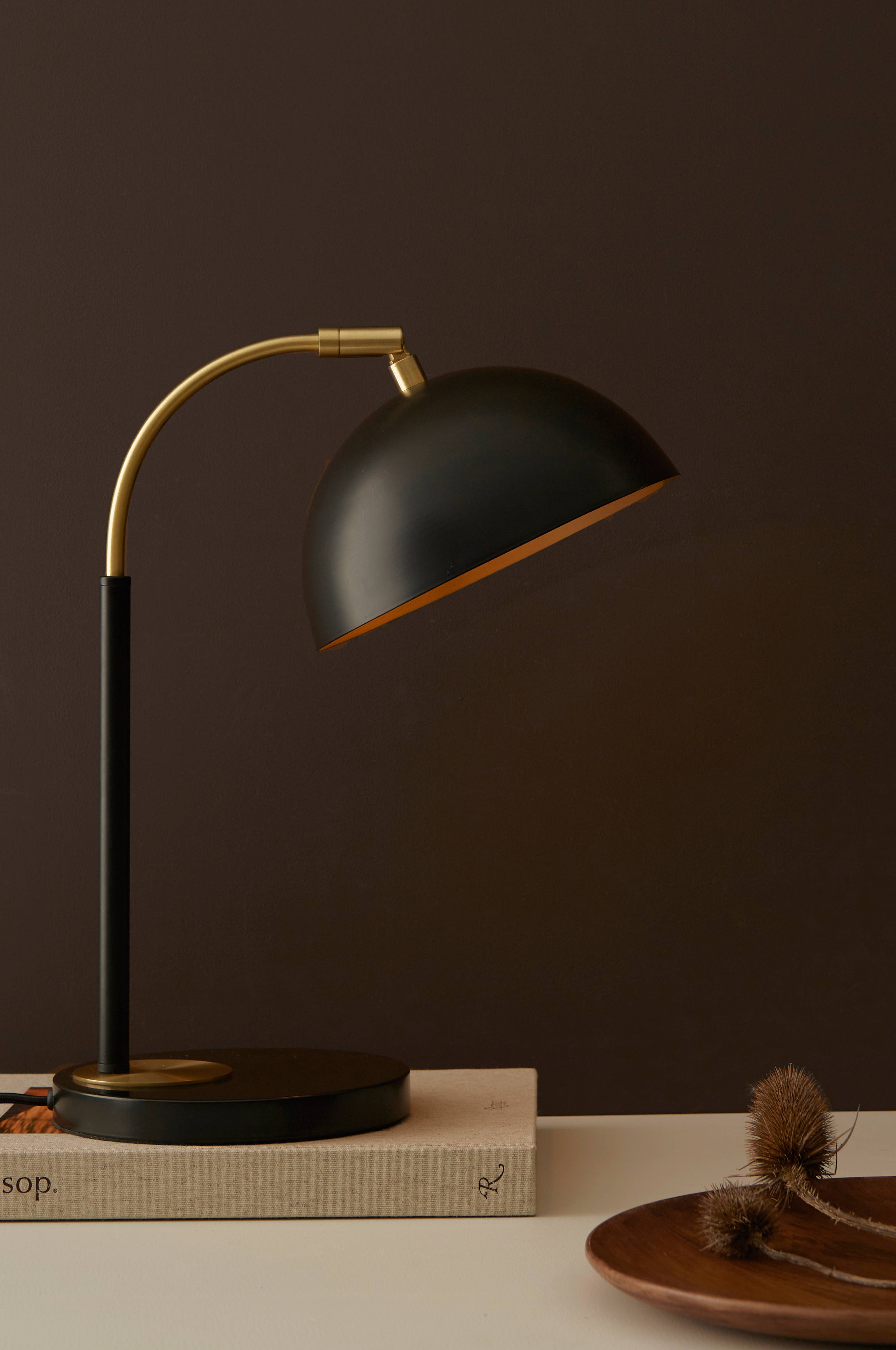 Bordlampe i metall med malt, matt finish og messingbelagte detaljer. Skjermen er justerbar sideveis og i høyden. Totale mål: Høyde 40 cm, dybde 28,5 cm. Skjermens mål: Diameter 20 cm, høyde 7 cm. Fotens mål: Diameter 18 cm, høyde 2,5 cm. Svart tekstilkledd ledning med strømbryter, ledningslengde 170 cm. Sokkel 2xE14. Maks 15W. Lyspære er ikke inkludert.